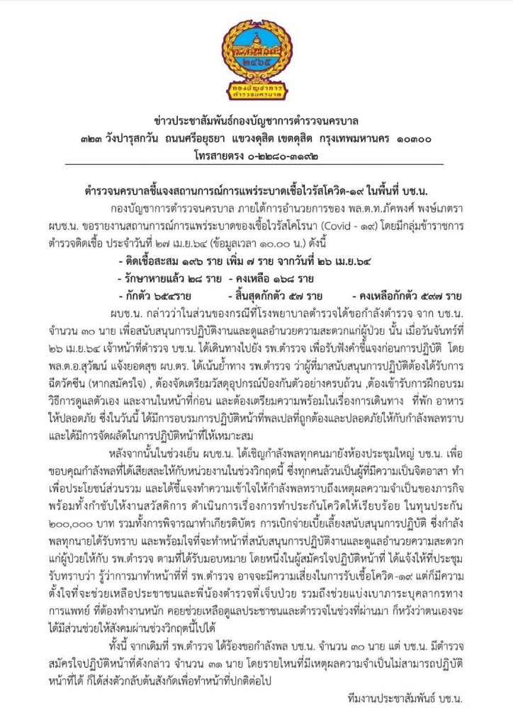 กองบัญชาการตำรวจนครบาล ภายใต้การอำนวยการของ พล.ต.ท.ภัคพงศ์ พงษ์เภตรา ผบช.น. ขอรายงานสถานการณ์การแพร่ระบาดของเชื้อไวรัสโคโรนา (Covid-19) โดยมีกลุ่มข้าราชการตำรวจติดเชื้อ ประจำวันที่ 27 เม.ย.64 (ข้อมูลเวลา 10.00 น.) ดังนี้ ติดเชื้อสะสม 196 ราย เพิ่ม 7 ราย จากวันที่ 26 เม.ย.64,รักษาหายแล้ว 28 ราย-คงเหลือ 168 ราย,กักตัว 654ราย-สิ้นสุดกักตัว 57 ราย-คงเหลือกักตัว 597 ราย
