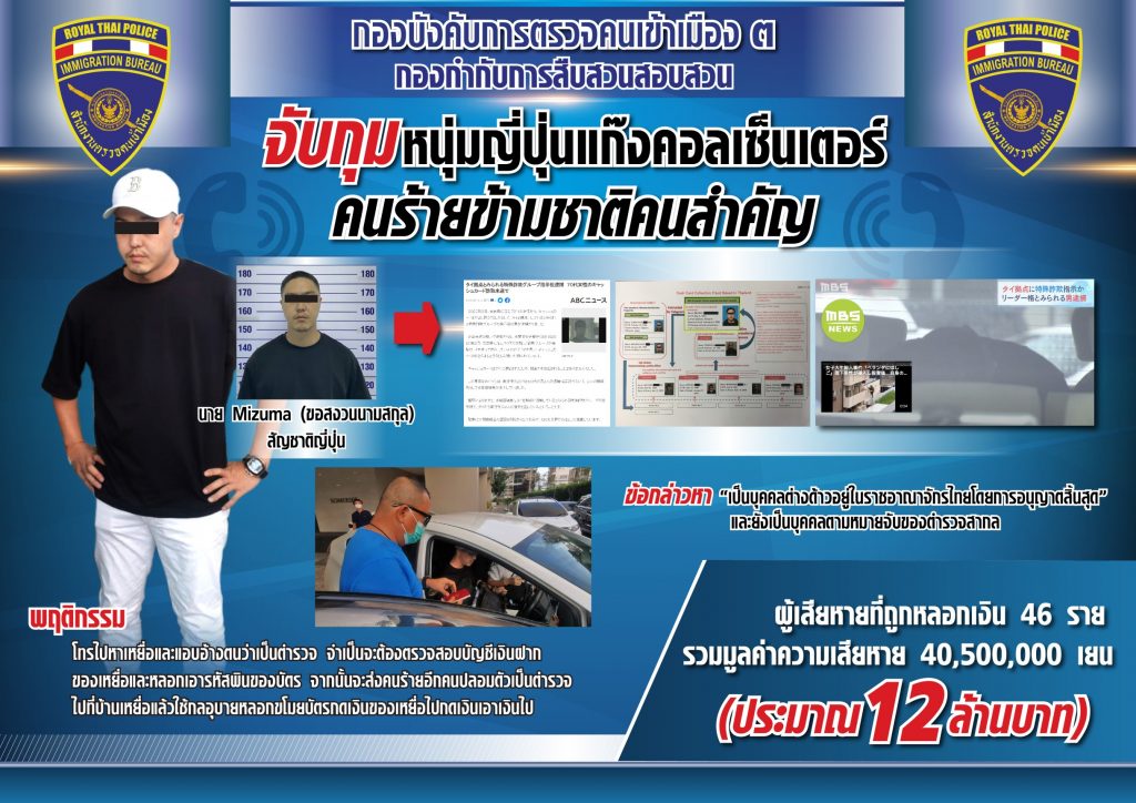 ของคนต่างชาติที่มีพฤติกรรมไม่เป็นที่พึงประสงค์ ซึ่งมีพฤติกรรมใช้ประเทศไทยเป็นฐานในการก่ออาชญากรรม หรือเป็นที่หลบหนีซ่อนตัวจากคดี โดยพฤติการณ์กรณีนี้คนร้ายรายนี้ชื่อ Mr.Mizuma อายุ 40 ปี ปรากฏข้อมูลจากทางการญี่ปุ่นว่าได้กระทำผิดในลักษณะแก๊งคอลเซ็นเตอร์โดยร่วมกับพวกจำนวน 8 คน มี Mr.Mizuma เป็นตัวการสำคัญผู้สั่งการในขบวนการนี้ทั้งหมด พฤติกรรมของแก๊งนี้จะโทร.ไปหาเหยื่อและแอบอ้างตนว่าเป็นเจ้าหน้าที่ตำรวจ จำเป็นจะต้องตรวจสอบบัญชีเงินฝากเหยื่อ แล้วหลอกเอารหัสพินของบัตร จากนั้นจะส่งคนร้ายอีกคนปลอมตัวเป็นตำรวจ ไปที่บ้านเหยื่อแล้วใช้กลอุบายหลอกขโมยบัตรกดเงินของเหยื่อไปกดเงินเอาเงินไป