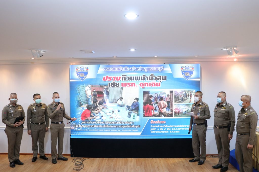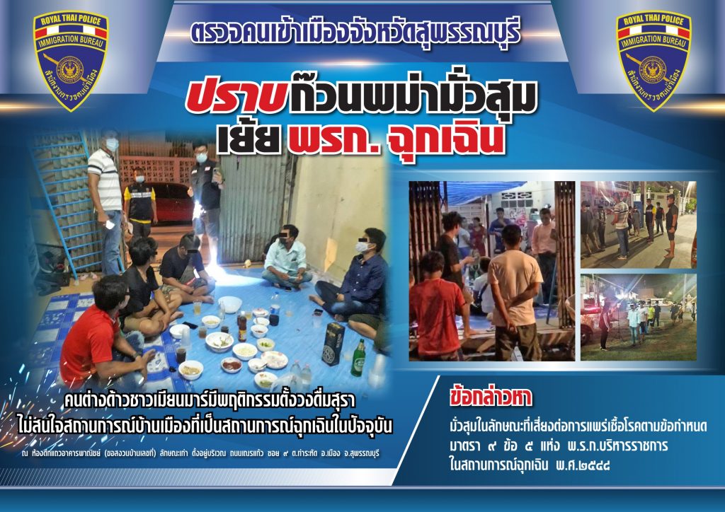 ในกรณีนี้ ชุดสืบสวน ตม.จ.สุพรรณบุรี ได้รับแจ้งเบาะแสว่า มีคนต่างด้าวชาวเมียนมา มีพฤติกรรมตั้งวงดื่มสุรา ไม่สนใจสถานการณ์บ้านเมืองที่เป็นสถานการณ์ฉุกเฉินในปัจจุบัน จึงได้ทำการสืบสวนหาข่าวพิสูจน์ทราบก็พบว่าสถานที่ดังกล่าว เป็นห้องตึกแถวอาคารพาณิชย์ ตั้งอยู่บริเวณ ถนนเณรแก้ว ต.ท่าระหัด อ.เมือง จ.สุพรรณบุรี จึงได้ร่วมกับหน่วยงานความมั่นคงและสาธารณะสุขในพื้นที่เข้าตรวจสอบสถานที่ดังกล่าว