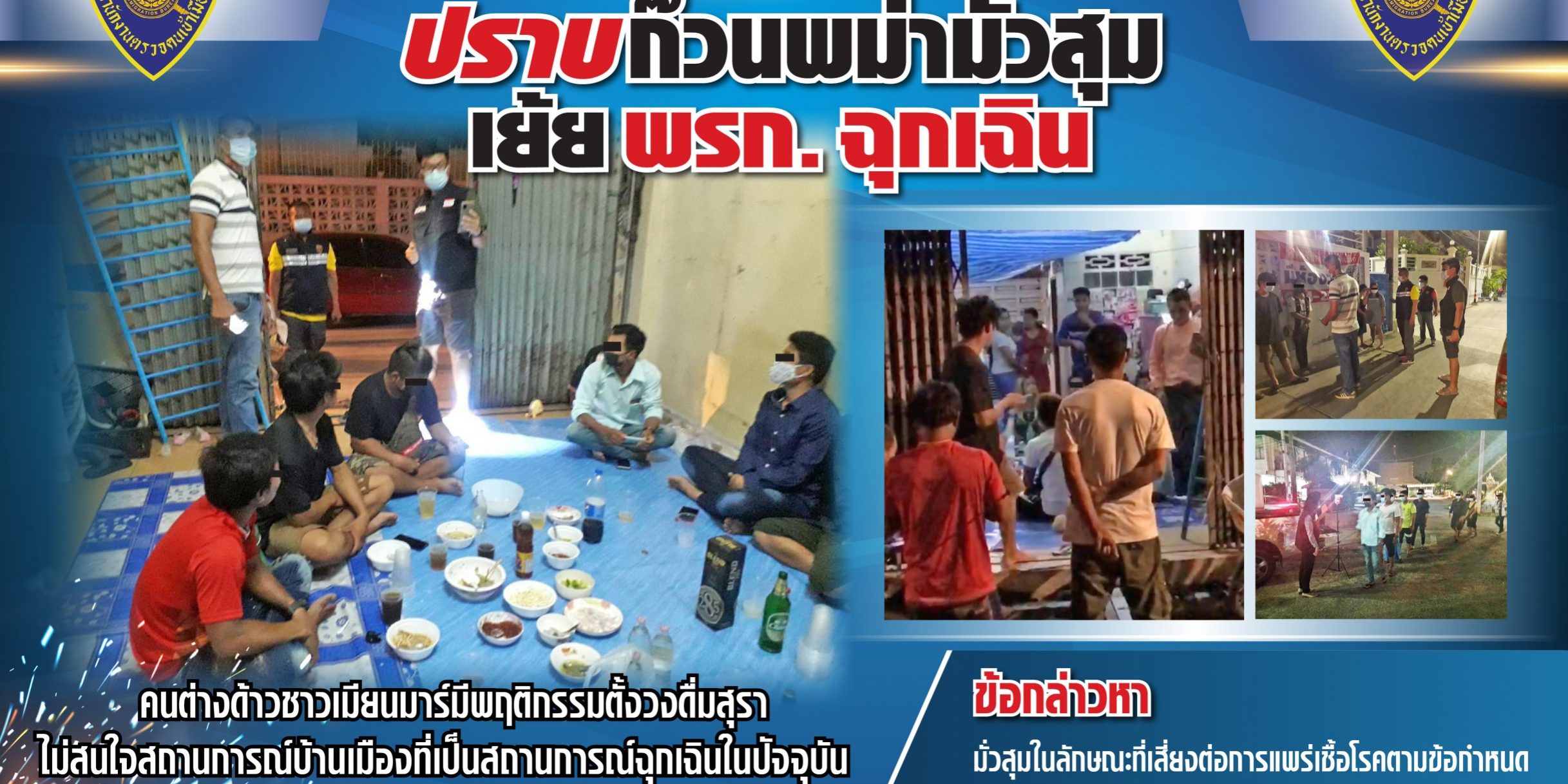 ผลการตรวจสอบพบว่า มีต่างด้าวชาวเมียนมา จำนวน 12 คน ตั้งวงดื่มสุราอาหาร และเสียงดังอย่างสนุกสนาน จึงได้แสดงตัวเป็นเจ้าหน้าที่เข้าตรวจสอบ พบว่ามีวีซ่าทำงานถูกต้อง แต่ก่อพฤติกรรมมั่วสุมซึ่งอาจเป็นต้นเหตุของการแพร่เชื้อไวรัสโควิด–19 จึงได้จับกุมตัวพร้อมแจ้งข้อกล่าวหาว่า “มั่วสุมในลักษณะที่เสี่ยงต่อการแพร่เชื้อโรคตามข้อกำหนด มาตรา 9 ข้อ 5 แห่ง พ.ร.ก.บริหารราชการในสถานการณ์ฉุกเฉิน พ.ศ.2548” นำส่งดำเนินคดีตามขั้นตอนของกฎหมายต่อไป