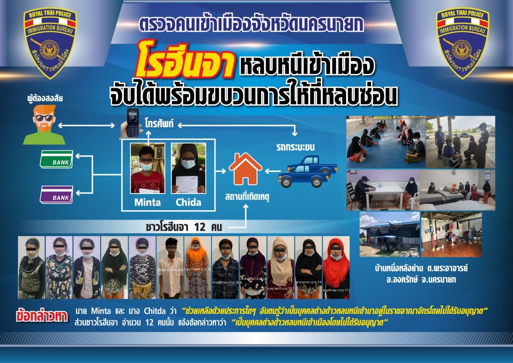 จ.นครนายก รับบุคคลลักษณะคล้ายคนต่างด้าวเชื้อสายมุสลิมแปลกหน้าหมุนเวียนเข้า-ออก อยู่บ่อยครั้ง เป็นพฤติกรรมที่น่าสงสัย เมื่อทราบข้อมูลจึงได้สืบสวนหาข่าวเพื่อพิสูจน์ทราบพบว่ามี Mr.Minta และ Mrs.Chitda คู่สามีภรรยาซึ่งเป็นบุคคลต่างด้าวชาวเมียนมา เชื้อสายมุสลิม และมีพฤติกรรมดังที่ได้รับแจ้งเบาะแสจริงโดยก่อนจะเกิดเหตุ 2 วัน มีรถต้องสงสัยจำนวน 1 คัน น่าจะขนคนเข้ามาส่งไว้สถานที่ดังกล่าว ต่อมาจึงได้บูรณาการกำลังหน่วยใกล้เคียงเข้าตรวจสอบที่พักดังกล่าว ซึ่งผลการตรวจสอบก็พบ คนต่างด้าวชาวเมียนมาเชื้อสายโรฮีนจา จำนวน 12 คน พักอาศัยอยู่กับ Mr.Minta โดยทั้งหมดหลบหนีเข้าเมืองไม่มีเอกสารใดๆยืนยันตัว จึงได้ข้อกล่าวหา Mr.Minta และ Mrs.Chitda ว่า “ช่วยเหลือด้วยประการใดๆ อันตนรู้ว่าเป็นบุคคลต่างด้าวหลบหนีเข้ามาอยู่ในราชอาณาจักรโดยไม่ได้รับอนุญาต” ส่วนชาวโรฮีนจา จำนวน 12 คนนั้น แจ้งข้อกล่าวหาว่า “เป็นบุคคลต่างด้าวหลบหนีเข้าเมืองโดยไม่ได้รับอนุญาต” นำส่งดำเนินคดีตามขั้นตอนของกฎหมายต่อไป