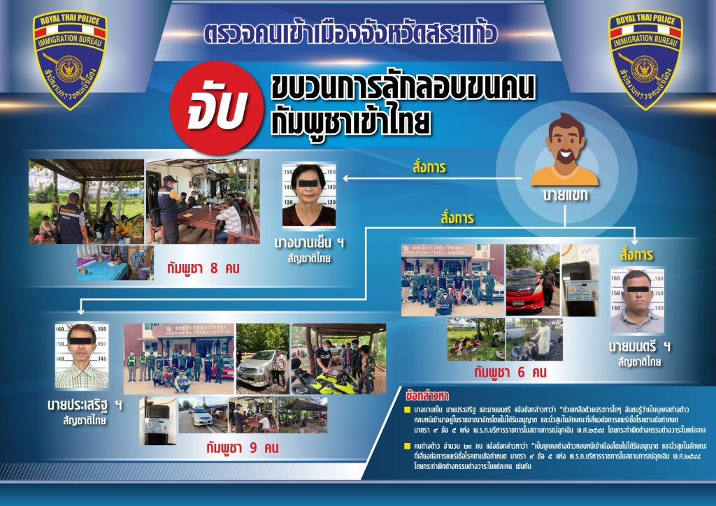 ตม.จ.สระแก้ว จับขบวนการลักลอบขนคนกัมพูชาเข้าไทย : เนื่องด้วยตรวจคนเข้าเมืองจังหวัดสระแก้ว ได้ทำการสืบสวนกลุ่มขบวนการลักลอบนำคนต่างด้าวเข้าเมืองซึ่งลักลอบเดินทางเข้ามาทางช่องทางธรรมชาติแถวบ้านเสม็ด หมู่ 3 ต.โคกสูง อ.โคกสูง จ.สระแก้ว โดยจะอยู่ตรงข้ามกับพื้นที่ อ.โอวจโรว จ.บันเตียนเมียนเจย ประเทศกัมพูชาพอดี ในครั้งนี้มีการสืบทราบว่าขบวนการนี้แบ่งหน้าที่กันทำโดยมีคนกัมพูชาเป็นผู้รับงาน