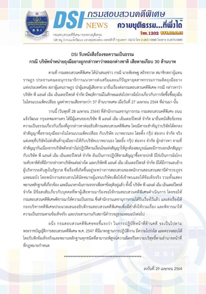 วานนี้ วันพุธที่ 28 เมษายน 2564 ที่สำนักงานเลขานุการกรม กรมสอบสวนคดีพิเศษ ถนนแจ้งวัฒนะ กรุงเทพมหานคร ได้มีผู้แทนของบริษัท พี แอนด์ เอ็ม เอ็นเตอร์ไพรส์ จำกัด มายื่นหนังสือร้องขอความเป็นธรรมเกี่ยวกับเรื่องที่ถูกกล่าวหาต่ออธิบดีกรมสอบสวนคดีพิเศษ โดยมีสาระสำคัญว่าบริษัทฯ ได้ตกลงทำสัญญาซื้อขายถุงมือยางไนไตรแบบแพ็คเปลือย กับบริษัท เบาหยวนธง โฮลดิ้ง กรุ๊ป ฮ่องกง จำกัด จริง แต่เหตุที่บริษัทไม่ส่งสินค้าถุงมือยางให้กับบริษัทเบาหยวนธง โฮลอิ้ง กรุ๊ป ฮ่องกง จำกัด ผู้กล่าวหา ตามที่ทำสัญญากันเนื่องจากบริษัทดังกล่าวไม่ปฏิบัติตามเงื่อนไขแห่งสัญญาให้ถูกต้องสมบูรณ์ และมีการบอกเลิกสัญญากับบริษัท พี แอนด์ เอ็ม เอ็นเตอร์ไพรส์ จำกัด อันเป็นการปฏิบัติตามสัญญาซื้อขายปกติ มิใช่เป็นการฉ้อโกงระดับชาติ ดังที่มีการกล่าวหาบริษัทแต่อย่างใด และบริษัทพี แอนด์ เอ็ม เอ็นเตอร์ไพรส์ จำกัด มิได้มีการแอบอ้างผู้บริหารระดับสูงในรัฐบาล