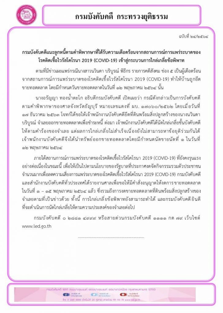 ภายใต้สถานการณ์การแพร่ระบาดของโรคติดเชื้อไวรัสโคโรนา 2019 (COVID-19) ที่ยังคงรุนแรงอย่างต่อเนื่องในขณะนี้ เพื่อให้เป็นไปตามนโยบายของรัฐบาลที่ประกาศงดจัดกิจกรรมรวมตัวประชาชนจำนวนมากเพื่อลดความเสี่ยงการแพร่ระบาดของโรคติดเชื้อไวรัสโคโรนา 2019 (COVID-19) กรมบังคับคดีและสำนักงานบังคับคดีทั่วประเทศได้รายงานศาลเพื่อขอให้มีคำสั่งอนุญาตให้งดการขายทอดตลาด ในวันที่ 1–15 พฤษภาคม 2564 แล้ว ซึ่งรวมถึงการงดขายทอดตลาดที่ดินพร้อมสิ่งปลูกสร้างของจำเลยตามที่เป็นข่าวด้วย ทั้งนี้ การไกล่เกลี่ยข้อพิพาทยังสามารถทำได้ และกรมบังคับคดียินดีที่จะดำเนินการนัดไกล่เกลี่ยให้ตามความประสงค์ของจำเลยต่อไป