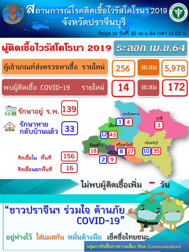 ทางด้าน สสจ.ปราจีนบุรี ได้รายงานสถานการณ์ผู้ติดเชื้อโควิค-19 ประจำวันที่ 30เมย.64 พบว่าผู้ติดเชื้อโควิด -19 อีก 14 ราย