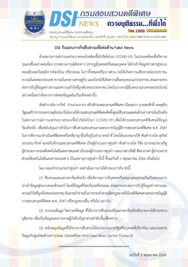 พันตำรวจโท กรวัชร์ ปานประภากร อธิบดีกรมสอบสวนคดีพิเศษ เปิดเผยว่า นายสมศักดิ์ เทพสุทิน รัฐมนตรีว่าการกระทรวงยุติธรรม มีนโยบายให้กรมสอบสวนคดีพิเศษจัดตั้งศูนย์สืบสวนและต่อต้านข่าวสารอันเป็นเท็จในสถานการณ์การแพร่ระบาดของเชื้อไวรัสโคโรนา (COVID-19) เพื่อให้กรมสอบสวนคดีพิเศษมีข้อมูลข้อเท็จจริง เพื่อสนับสนุนภารกิจในการสืบสวนสอบสวนตามพระราชบัญญัติการสอบสวนคดีพิเศษ พ.ศ.2547 ในการพิจารณาดำเนินคดีพิเศษหรือคดีอาญาอื่นที่อยู่ในอำนาจหน้าที่ โดยได้มอบหมายให้ พันตำรวจโท สุภัทธ์ ธรรมธนารักษ์ รองอธิบดีกรมสอบสวนคดีพิเศษ เป็นผู้อำนวยการศูนย์ฯ,พันตำรวจโท วิชัย สุวรรณประเสริฐ ผู้อำนวยการกองคดีเทคโนโลยีและสารสนเทศ เป็นรองผู้อำนวยการศูนย์ฯ และนางสาวรัศมี สีตลวรางค์ ผู้อำนวยการส่วนคดีเทคโนโลยีและสารสนเทศ 2 เป็นเลขานุการศูนย์ฯ