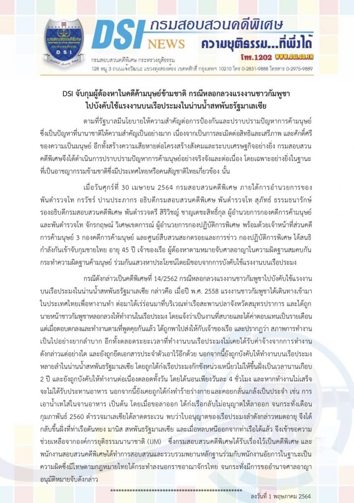 จากกรณีดังกล่าวเป็นคดีพิเศษที่ 14/2562 กรณีหลอกลวงแรงงานชาวกัมพูชาไปบังคับใช้แรงงานบนเรือประมงในน่านน้ำสหพันธรัฐมาเลเซีย กล่าวคือ เมื่อปี พ.ศ.2558 แรงงานชาวกัมพูชาได้เดินทางเข้ามาในประเทศไทยเพื่อหางานทำ ต่อมาได้เร่ร่อนมาที่บริเวณท่าเรือสะพานปลาจังหวัดสมุทรปราการ และได้ถูกนายหน้าชาวกัมพูชาหลอกลวงให้ทำงานในเรือประมง โดยแจ้งว่าเป็นงานที่สบาย และได้ค่าตอบแทนเป็นรายเดือน แต่เมื่อตอบตกลงและทำงานตามที่พูดคุยกันแล้ว ได้ถูกพาไปส่งให้กับเจ้าของเรือ และปรากฏว่า สภาพการทำงานเป็นไปอย่างยากลำบาก อีกทั้งตลอดระยะเวลาที่ทำงานบนเรือประมงไม่เคยได้รับค่าจ้างจากการทำงานดังกล่าวแต่อย่างใด และยังถูกยึดเอกสารประจำตัวเอาไว้อีกด้วย แถมยังถูกบังคับให้ทำงานบนเรือประมงหลายลำในน่านน้ำสหพันธรัฐมาเลเซีย โดยถูกไต้ก๋งเรือประมงกักขังหน่วงเหนี่ยวไม่ให้ขึ้นฝั่งเป็นเวลานานเกือบ 2 ปี และยังถูกบังคับให้ทำงานต่อเนื่องตลอดทั้งวัน โดยได้นอนเพียงวันละ 4 ชั่วโมง หากทำงานไม่เสร็จ จะไม่ได้รับประทานอาหาร