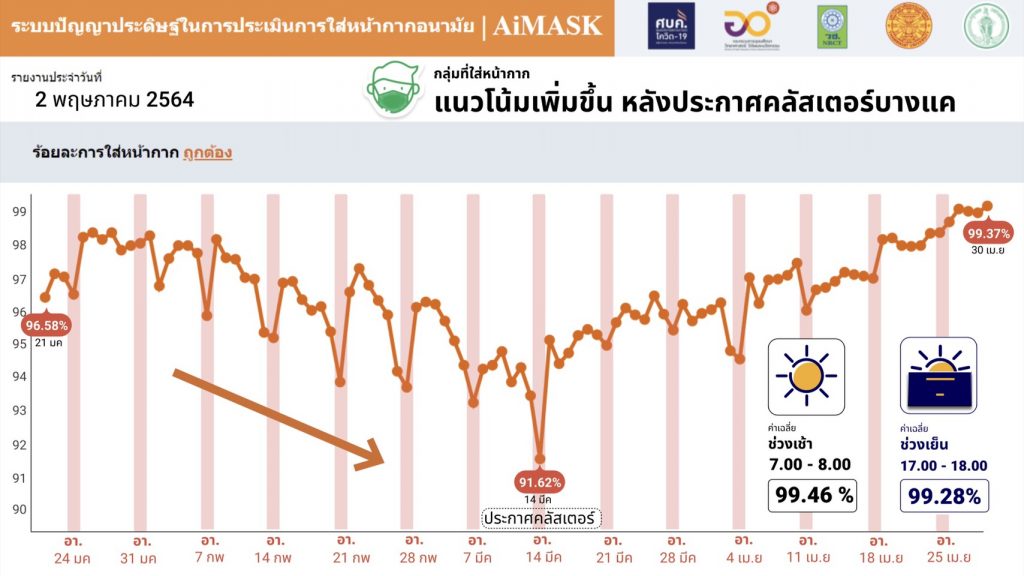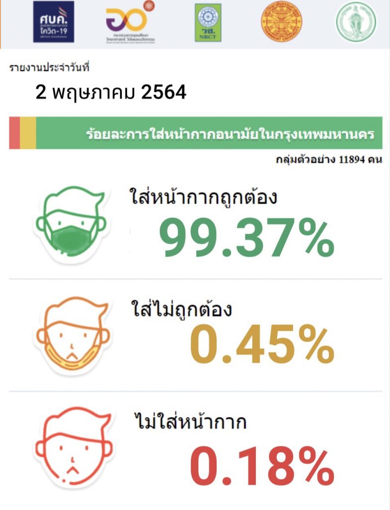 วันที่ 2 พฤษภาคม 2564 : ตามที่ได้มีการยกระดับมาตรการควบคุมการติดเชื้อโควิด-19 ที่ยังคงมีการระบาดอยู่ตั้งแต่ช่วงต้นเดือนเมษายนที่ผ่านมาและมีผู้ติดเชื้อจำนวนมาก กระทรวงการอุดมศึกษา วิทยาศาสตร์ วิจัยและนวัตกรรม (อว.) ได้รายงานผลการติดตามการใส่หน้ากากอนามัย โดยใช้ระบบปัญญาประดิษฐ์ (เอไอ) แบบเรียลไทม์ โดยเอสไอไอที มหาวิทยาลัยธรรมศาสตร์ ร่วมกับสำนักงานการวิจัยแห่งชาติ (วช.) พบว่าในขณะนี้คนกรุงเทพฯใส่หน้ากากอนามัยในที่สาธารณะสูงถึง 99.37% ซึ่งเป็นสถิติที่สูงที่สุดเท่าที่ได้ประเมินการให้ความร่วมมือใส่หน้ากากอนามัย โดยมีผู้ที่ไม่ใส่หน้ากากหรือใส่ไม่ถูกต้องรวมกันเพียง 0.63% หรือเท่ากับมีผู้ที่ไม่ใส่หน้ากากอนามัยเพียง 2 ใน 1000 คน และใส่แต่ไม่ถูกต้องเพียง 4 ใน 1000 คนเท่านั้น