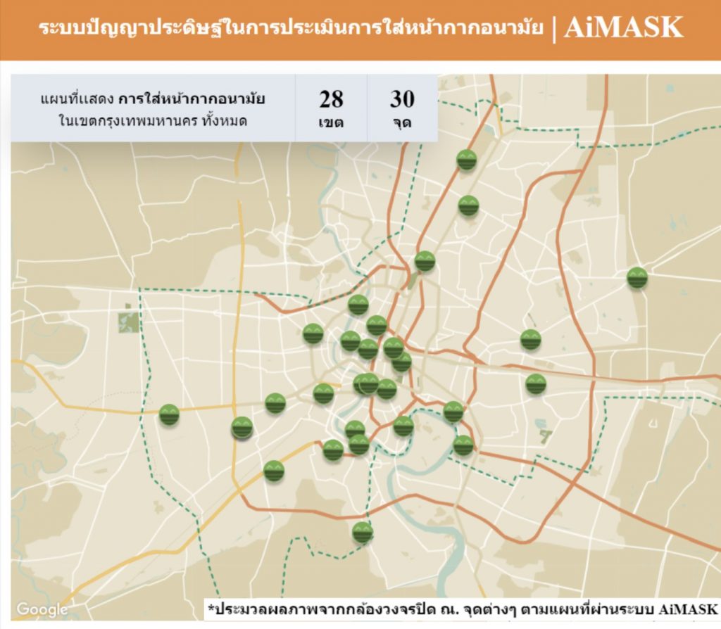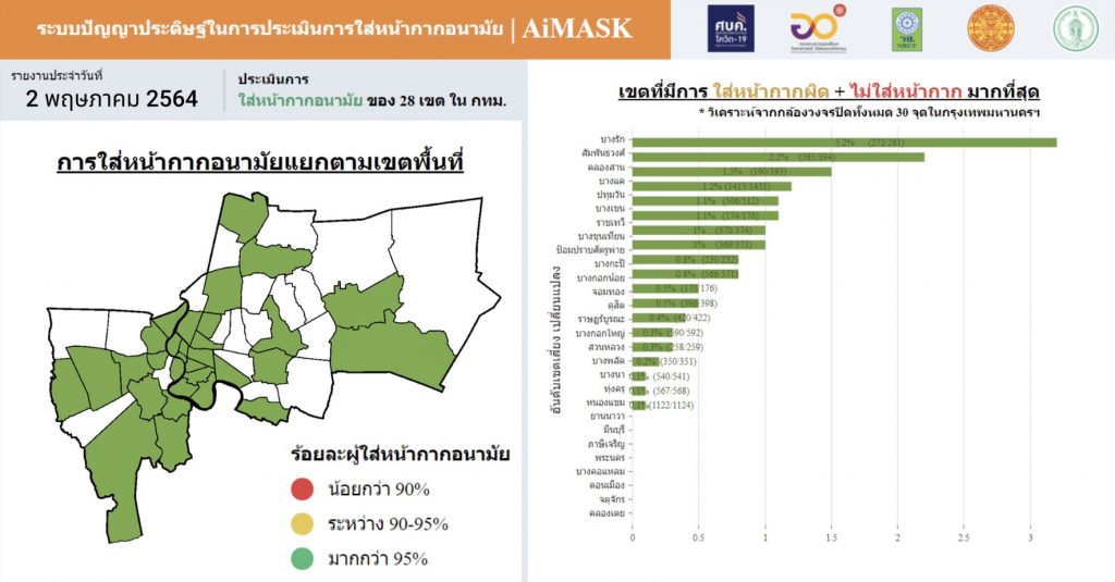 ศ.ดร.ธนารักษ์ ธีระมั่นคง สถาบันเทคโนโลยีนานาชาติสิรินธร (SIIT) มหาวิทยาลัยธรรมศาสตร์ รายงานว่า “ข้อมูลเล่าสุดได้ประเมินแบบอัตโนมัติในประชากร 11,894 คน เมื่อวันที่ 30 เมษายน 2564 จาก 30 จุด ใน 28 เขตทั่วกรุงเทพมหานคร โดยทุกจุดมีผู้ใส่หน้ากากอนามัยมากกว่า 95% และมี 8 จุดในเขตยานนาวา,มีนบุรี,ภาษีเจริญ,พระนคร,บางคอแหลม,ดอนเมือง,จตุจักร และคลองเตย ประชาชนที่สัญจรไปมาได้ใส่หน้ากากอนามัย 100% แล้ว”