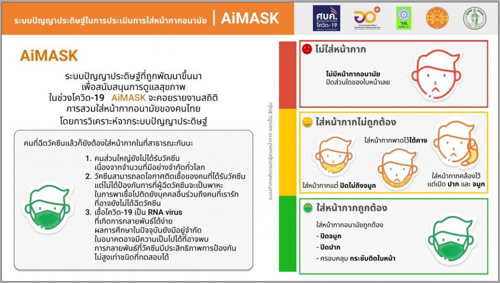 Cr.แหล่งข้อมูล: โครงการระบบปัญญาประดิษฐ์ (ระบบเอไอมาสค์ AiMASK) ในการประเมินการใส่หน้ากากอนามัย พัฒนาโดยคณะผู้วิจัยสถาบันเทคโนโลยีนานาชาติสิรินธร มหาวิทยาลัยธรรมศาสตร์ สมาคมปัญญาประดิษฐ์ประเทศไทย และโครงการซูเปอร์เอไอเอ็นจิเนียร์ สนับสนุนโดยสำนักงานการวิจัยแห่งชาติ (วช.) กระทรวงการอุดมศึกษา วิทยาศาสตร์ วิจัยและนวัตกรรม (อว.)