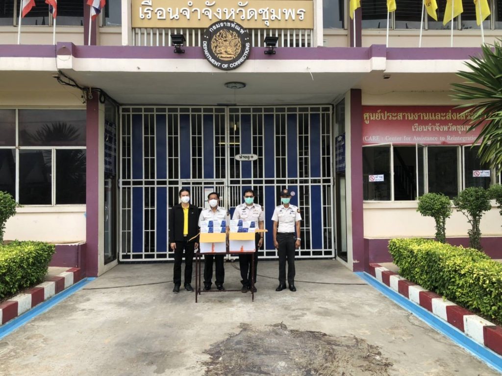 1.มอบหน้ากากอนามัย จำนวน 15,000 ชิ้น เเละเจลแอลกอฮอล์ จำนวน 200 ลิตร ให้กับ เรือนจำ จังหวัดชุมพร โดยมี นายมนู ท้วมทอง ผบ.เรือนจำ และนายนัฐพล บุญสิทธิ์ หัวหน้าฝ่ายฝึกวิชาชืพ ร่วมรับมอบ