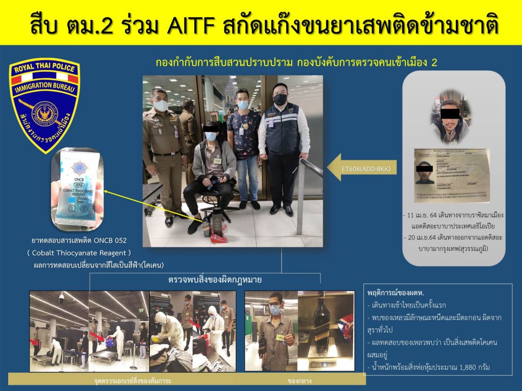 ซึ่งเดินทางจากประเทศเอธิโอเปีย โดยสายการบินสายการบินเอธิโอเปียน แอร์ไลน์ เที่ยวบินที่ ET608 ลักลอบขนยาเสพติดให้โทษประเภท 2 (โคคาอีน) เดินทางเข้าราชอาณาจักร โดยได้ลักลอบขนยาเสพติด (โคคาอีน) ซึ่งบรรจุอยู่ในขวดสุรา ขนาด 1 ลิตร จำนวน 1 ขวด น้ำหนักรวมสิ่งห่อหุ้ม ประมาณ 1,880 กรัม ภายในขวดบรรจุยาเสพติดให้โทษประเภท 2 (โคคาอีน) ผสมสุรา มีลักษณะเป็นของเหลวหนืดและมีตะกอน ผิดจากสุราทั่วไป ซึ่งเจ้าหน้าที่ได้นำของเหลวในขวดสุราไปทดสอบด้วยน้ำยาทดสอบยาเสพติด ONCB 052 COBALT THIOCYANATE REAGENT ซึ่งผลทดสอบพบของเหลวเปลี่ยนจากสีใสกลายเป็นสีฟ้า แสดงความหมายว่าสิ่งที่พบเป็นโคเคน จึงได้ดำเนินการจับกุมในฐานความผิด “นำเข้ายาเสพติดให้โทษประเภท 2 (โคคาอีน) มาในราชอาณาจักรโดยไม่ได้รับอนุญาต และมียาเสพติดให้โทษประเภท 2 (โคคาอีน) ไว้ในครอบครองโดยไมได้รับอนุญาต” และนำส่ง พนักงานสอบสวน สภ.ท่าอากาศยานสุวรรณภูมิ เพื่อดำเนินคดีตามกฎหมายต่อไป