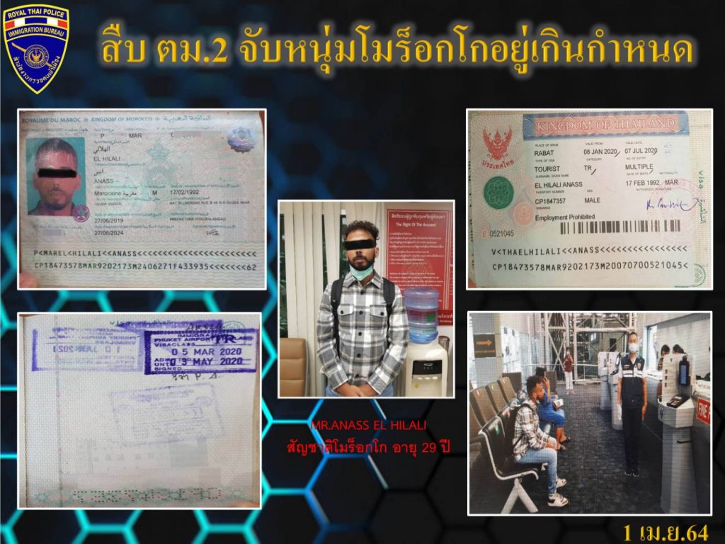 3.สืบสวน ตม.2 จับกุมหนุ่มโมร็อกโกอยู่เกินกำหนดอนุญาต : กก.สส.ปป.บก.ตม.2 ร่วมกับฝ่ายตรวจคนเข้าเมืองขาออก ด่านตรวจคนเข้าเมืองท่าอากาศยานสุวรรณภูมิ ตรวจบุคคลต่างด้าว บริเวณชั้น 4 อาคารผู้โดยสารท่าอากาศยานสุวรรณภูมิ พบบุคคลต่างด้าวต้องสงสัย จึงแสดงตัวขอตรวจค้น พบว่าเป็นบุคคลสัญชาติโมร็อกโกอยู่เกินกำหนดอนุญาต จำนวน 152 วัน โดยเดินทางเข้ามาในราชอาณาจักรเมื่อวันที่ 5 มีนาคม 2563 ได้รับอนุญาตให้อยู่ในราชอาณาจักรตามวีซ่าประเภทนักท่องเที่ยวถึงวันที่ 3 พฤษภาคม 2563 และจากการตรวจสอบระบบสารสนเทศสำนักงานตรวจคนเข้าเมือง (BIOMETRICS) ไม่พบข้อมูลการขออยู่ต่อในราชอาณาจักรแต่อย่างใด จึงได้แจ้งข้อกล่าวหา “เป็นบุคคลต่างด้าวอยู่ในราชอาณาจักรโดยการอนุญาตสิ้นสุด” จับกุมตัวส่งพนักงานสอบสวน สภ.ท่าอากาศยานสุวรรณภูมิ ดำเนินคดีตามกฎหมายต่อไป