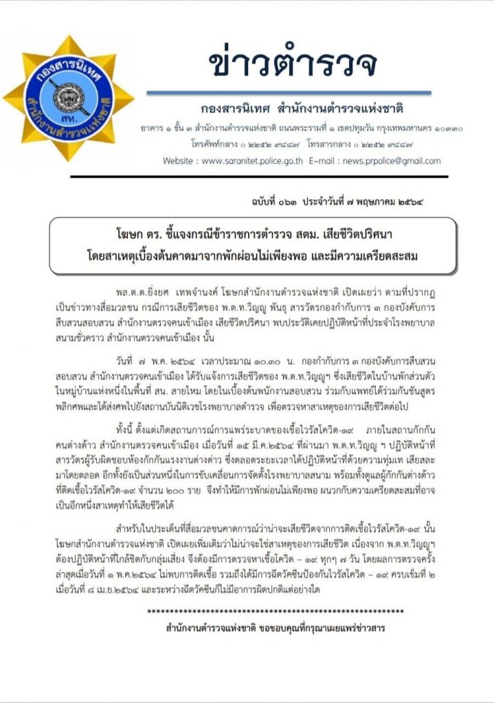 โฆษก ตร. ชี้แจงกรณีข้าราชการตำรวจ สตม. เสียชีวิตปริศนา โดยสาเหตุเบื้องต้นคาดมาจากพักผ่อนไม่เพียงพอ และมีความเครียดสะสม