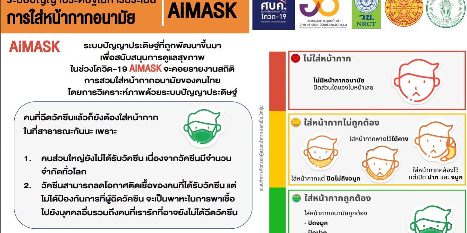 แหล่งข้อมูล: โครงการระบบปัญญาประดิษฐ์ (ระบบเอไอมาสค์ AiMASK) ในการประเมินการใส่หน้ากากอนามัย พัฒนาโดยคณะผู้วิจัยนำโดย ศาสตราจารย์ ดร.ธนารักษ์ ธีระมั่นคง และทีมวิจัยจากสถาบันเทคโนโลยีนานาชาติสิรินธร มหาวิทยาลัยธรรมศาสตร์ สมาคมปัญญาประดิษฐ์ประเทศไทย และโครงการซูเปอร์เอไอเอ็นจิเนียร์ สนับสนุนโดยสำนักงานการวิจัยแห่งชาติ (วช.) กระทรวงการอุดมศึกษา วิทยาศาสตร์ วิจัยและนวัตกรรม (อว.)