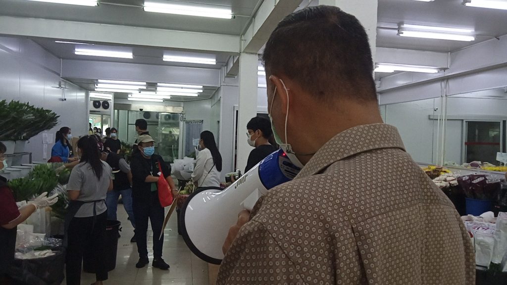 ทั้งนี้การลงพื้นที่วันนี้เพื่อทำกิจกรรมทำความสะอาดล้างพื้นผิวทางเดินฟุตบาท ล้างทำความสะอาดตลาด พื้นที่ปากคลองตลาดโดยรอบ รวมทั้ง ประชาสัมพันธ์ แก่ ผู้ประกอบการร้านค้า หาบเร่ แผงลอย ขอความร่วมมือ ผู้ประกอบการ งด หยุด ทำการค้า 3 วัน เพื่อเป็นการหยุดการแพร่ระบาดของเชื้อไวรัส Covid-19 เนื่อง จากผลของการตรวจหาเชื้อ Covid-19 ที่ผ่านมา พบผู้ติดเชื้อ covid-19 จำนวน 81 คน เบื้องต้น เพื่อเป็นการหยุดการแพร่ระบาดของเชื้อ Covid-19 จึงขอความร่วมมือผู้ประกอบการร้านค้าพื้นที่ปากคลองตลาด ในวันนี้