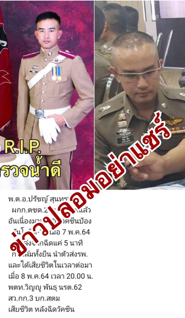 วันที่ 7 พ.ค.64 “พ.ต.อ.ปรัชญ์ สุนทรพิมล ผกก.ตชด.21 เสียชีวิตแล้ว อันเนื่องมาจากฉีดวัคซีนป้องกันโควิด-19 หลังจากฉีดแค่ 5 นาที ก็ได้ล้มทั้งยืน นำตัวส่ง รพ.ซึ่งได้เสียชีวิตในเวลาต่อมา และ เมื่อวันที่ 8 พ.ค.64 เวลา 20.00 น. พ.ต.ท.วิญญู พันธุ นรต.62 สว.กก.3 บก.สตม.เสียชีวิต หลังฉีดวัคซีนฯ รวมทั้ง “พ.ต.ท.หญิง ศรัณย์รัชต์ วังสะปัญญา อายุ 56 ปี รอง ผกก.ฝ่ายตรวจลงตรา ด่าน ตม.ทอ.สุวรรณภูมิ เสียชีวิตอย่างปริศนา และต่อมามีข่าวว่าสาเหตุมาจากที่ได้ทดลองฉีดวัคซีนโควิด-19”