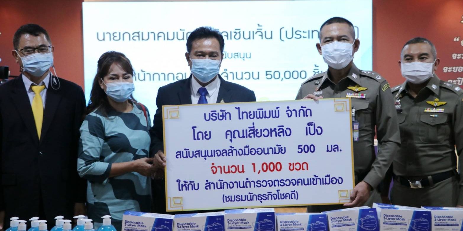 2.คณะผู้แทน คุณเสี่ยวหลิง เป็ง กรรมการผู้จัดการ บริษัท ไทยพิมพ์ จำกัด มอบเจลแอลกอฮอล์ ขนาด 500 มล. จำนวน 1,000 ขวด (มูลค่า 120,000 บาท)