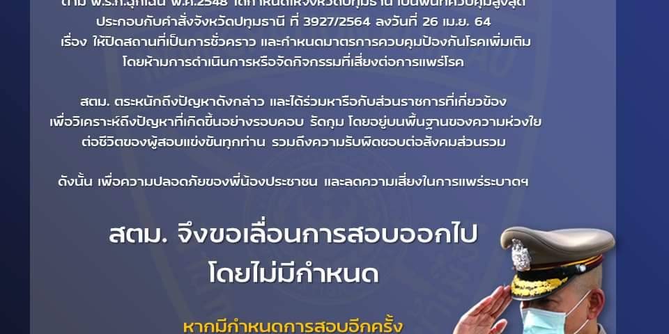 ด้วยมีสถานการณ์การแพร่ระบาดของโรคไวรัสโควิด-19 และ สตม. ได้กำหนดพื้นที่สอบในจังหวัดปทุมธานี ตามพ.ร.ก.ฉุกเฉิน พ.ศ.2548 ได้กำหนดให้จังหวัดปทุมธานี เป็นพื้นที่ควบคุมสูงสุดประกอบกับคำสั่งจังหวัดปทุมธานี ที่ 3927/2564 ลงวันที่ 26 เม.ย.64 เรื่องให้ปิดสถานที่เป็นการชั่วคราว และกำหนดมาตรการควบคุมป้องกันโรคเพิ่มเติม โดยห้ามการดำเนินการหรือจัดกิจกรรมที่เสี่ยงต่อการแพร่โรค
