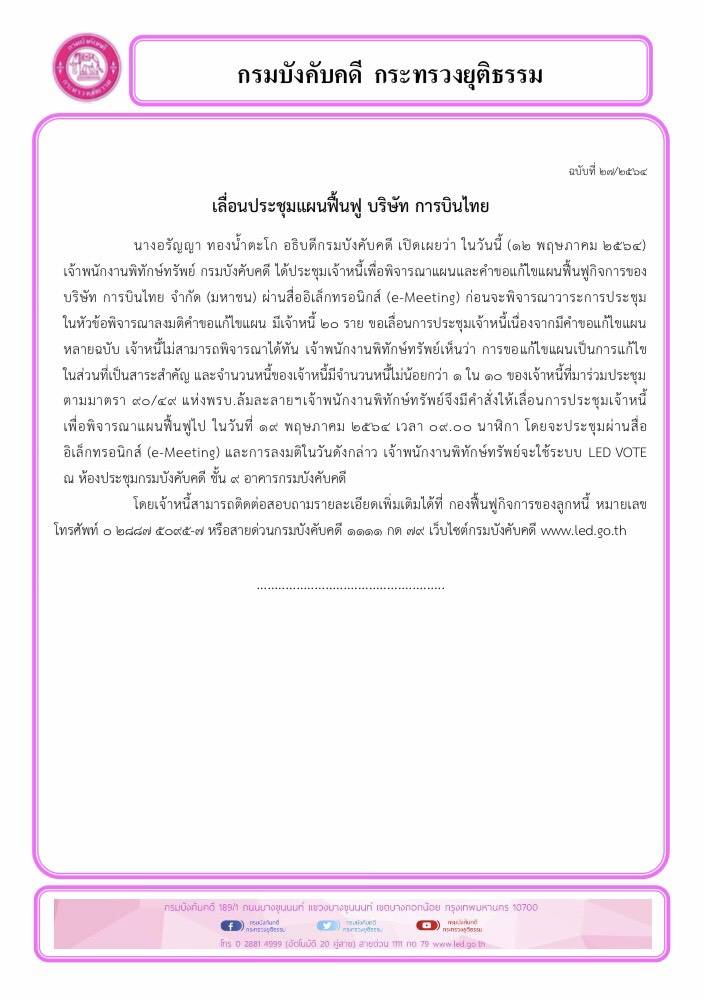 นางอรัญญา ทองน้ำตะโก อธิบดีกรมบังคับคดี เปิดเผยว่า “เจ้าพนักงานพิทักษ์ทรัพย์ กรมบังคับคดี ได้ประชุมเจ้าหนี้เพื่อพิจารณาแผนและคำขอแก้ไขแผนฟื้นฟูกิจการของ บริษัท การบินไทย จำกัด (มหาชน) ผ่านสื่ออิเล็กทรอนิกส์ (e-Meeting) ก่อนจะพิจารณาวาระการประชุมในหัวข้อพิจารณาลงมติคำขอแก้ไขแผน มีเจ้าหนี้ 20 ราย ขอเลื่อนการประชุมเจ้าหนี้เนื่องจากมีคำขอแก้ไขแผนหลายฉบับ เจ้าหนี้ไม่สามารถพิจารณาได้ทัน เจ้าพนักงานพิทักษ์ทรัพย์เห็นว่า การขอแก้ไขแผนเป็นการแก้ไขในส่วนที่เป็นสาระสำคัญ และจำนวนหนี้ของเจ้าหนี้มีจำนวนหนี้ไม่น้อยกว่า 1 ใน 10 ของเจ้าหนี้ที่มาร่วมประชุม ตามมาตรา 90/49 แห่งพรบ.ล้มละลายฯเจ้าพนักงานพิทักษ์ทรัพย์จึงมีคำสั่งให้เลื่อนการประชุมเจ้าหนี้เพื่อพิจารณาแผนฟื้นฟูไป ในวันที่ 19 พฤษภาคม 2564 เวลา 09.00 น. โดยจะประชุมผ่านสื่ออิเล็กทรอนิกส์ (e-Meeting) และการลงมติในวันดังกล่าว เจ้าพนักงานพิทักษ์ทรัพย์จะใช้ระบบ LED VOTE ณ ห้องประชุมกรมบังคับคดี ชั้น 9 อาคารกรมบังคับคดี