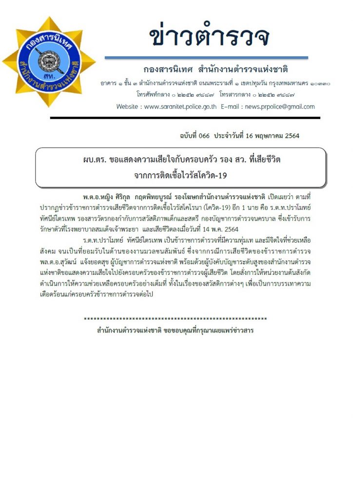 วันที่ 16 พฤษภาคม 2564 : พ.ต.อ.หญิง ศิริกุล กฤตพิทยบูรณ์ รองโฆษกสำนักงานตำรวจแห่งชาติ เปิดเผยว่า ตามที่ปรากฏข่าวข้าราชการตำรวจเสียชีวิตจากการติดเชื้อไวรัสโคโรนา (โควิด-19) อีก 1 นาย คือ ร.ต.ท.ปราโมทย์ ทัศนีย์ไตรเทพ รองสารวัตรกองกำกับการสวัสดิภาพเด็กและสตรี กองบัญชาการตำรวจนครบาล ซึ่งเข้ารับการรักษาตัวที่โรงพยาบาลสมเด็จเจ้าพระยา และเสียชีวิตลงเมื่อวันที่ 14 พ.ค.64
