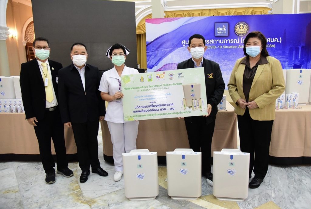 ศาสตราจารย์ ดร.นพ.สิริฤกษ์ ทรงศิวิไล ปลัดกระทรวงการอุดมศึกษา วิทยาศาสตร์ วิจัยและนวัตกรรม (อว.) พร้อมด้วย ดร.วิภารัตน์ ดีอ่อง ผู้อำนวยการสำนักงานการวิจัยแห่งชาติ (วช.) และนายพิศิษฐ์ มิตรเกื้อกูล นายกสมาคมกีฬาเครื่องบินจำลองและวิทยุบังคับ ส่งมอบ “นวัตกรรมเครื่องฟอกอากาศแบบผลิตออกซิเจน บวก-ลบ” จำนวน 140 เครื่อง เพื่อสนับสนุนภารกิจของศูนย์บริการทางการแพทย์ โรงพยาบาลและหน่วยงานส่วนหน้าที่ดูแลผู้ป่วยในสถานการณ์การแพร่ระบาดโรคโควิด-19 เมื่อวันที่ 16 พฤษภาคม 2564 ณ ศูนย์บริหารสถานการณ์แพร่ระบาดของโรคติดเชื้อไวรัสโคโรนา 2019 (ศบค.) ตึกสันติไมตรี ทำเนียบรัฐบาล กรุงเทพมหานคร โดยมี พลเอกณัฐพล นาคพาณิชย์ เลขาธิการสภาความมั่นคงแห่งชาติ ในฐานะประธานศูนย์ปฏิบัติการ ศูนย์บริหารสถานการณ์โควิด-19 (ศปก.ศบค.) เป็นผู้รับมอบ พร้อมด้วย สถานีตำรวจภูธรท่ามะกา จังหวัดกาญจนบุรี โดยพันตำรวจเอกอาริส คูประสิทธิรัตน์ ผู้กำกับการสถานีตำรวจภูธรท่ามะกา,โรงพยาบาลกลาง โดย นางสาวอภิรดี สุนันทตานนท์ รองผู้อำนวยการโรงพยาบาลกลาง และศูนย์บริการการแพทย์ฉุกเฉินกรุงเทพมหานคร (ศูนย์เอราวัณ) โดยนางสาวอรุณี ทองดี พยาบาลวิชาชีพชำนาญการ เป็นผู้รับมอบนวัตกรรมฯ