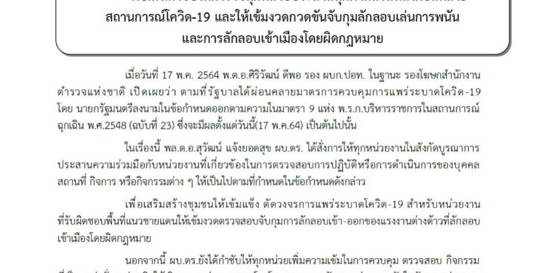 ในเรื่องนี้ พล.ต.อ.สุวัฒน์ แจ้งยอดสุข ผบ.ตร. ได้สั่งการให้ทุกหน่วยงานในสังกัดบูรณาการประสานความร่วมมือกับหน่วยงานที่เกี่ยวข้องในการตรวจสอบการปฏิบัติหรือการดำเนินการของบุคคล สถานที่ กิจการ หรือกิจกรรมต่างๆ ให้เป็นไปตามที่กำหนดในข้อกำหนดดังกล่าว เพื่อเสริมสร้างชุมชนให้เข้มแข็ง ตัดวงจรการแพร่ระบาดโควิด-19 สำหรับหน่วยงาน ที่รับผิดชอบพื้นที่แนวชายแดนให้เข้มงวดตรวจสอบจับกุมการลักลอบเข้า-ออกของแรงงานต่างด้าวที่ลักลอบเข้าเมืองโดยผิดกฎหมาย