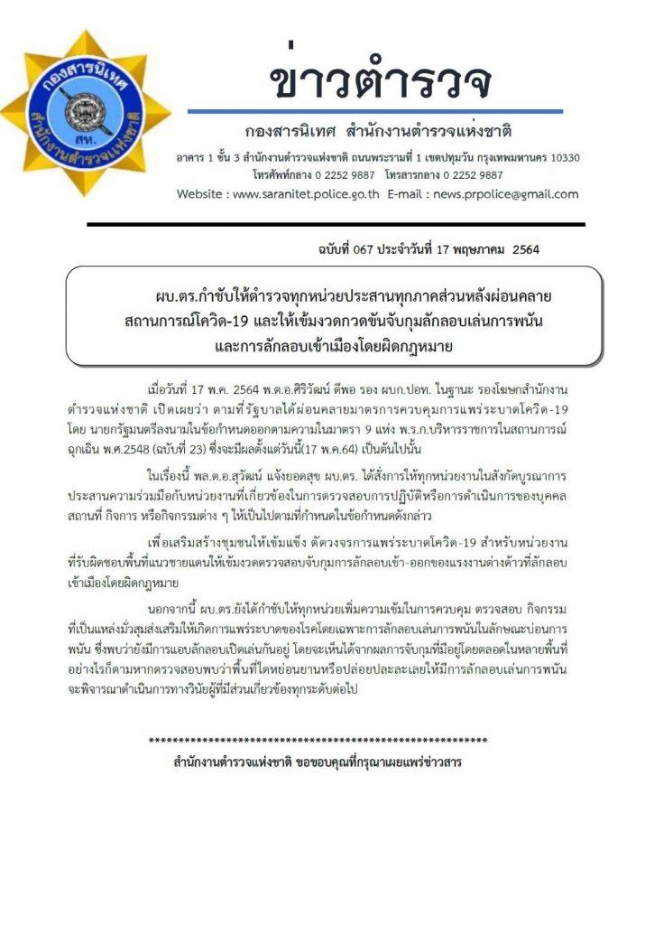 วันที่ 17 พ.ค.64 : พ.ต.อ.ศิริวัฒน์ ดีพอ รอง ผบก.ปอท. ในฐานะ รองโฆษกสำนักงานตำรวจแห่งชาติ เปิดเผยว่า ตามที่รัฐบาลได้ผ่อนคลายมาตรการควบคุมการแพร่ระบาดโควิด-19