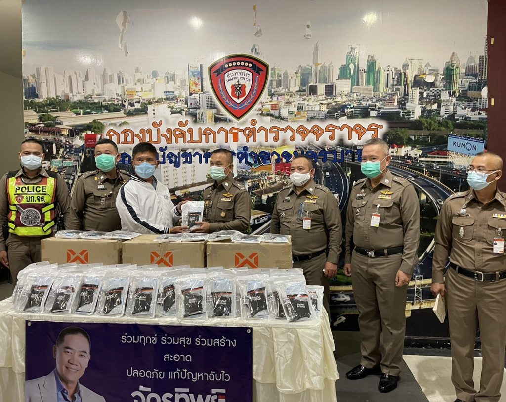 พล.ต.อ.จักรทิพย์ ชัยจินดา อดีด ผบ.ตร. มอบหมาย ให้ พล.ต.ท.สุทธิพงษ์ วงศ์ปิ่น และ พล.ต.ท.ชาญเทพ เสสะเวช อดีด ผบช.น.นำหน้ากากอนามัย และเจลแอลกอฮอล์ล้างมือ เพื่อป้องกันโควิด-19 มอบให้ กองบังคับการตำรวจจราจร โดยมี พ.ต.อ.สุกิจ อรุณเลิศถวิล,พ.ต.อ.สมชาย เขียวจักร และ พ.ต.อ.ศราวุธ จิตต์ระเบียบ รอง ผบก.บก.จร. ร่วมรับมอบ เพื่อนำไปให้ ผู้ใต้บังคับบัญชา ใช้ในการป้องกันการปฏิบัติหน้าที่บริการประชาชน