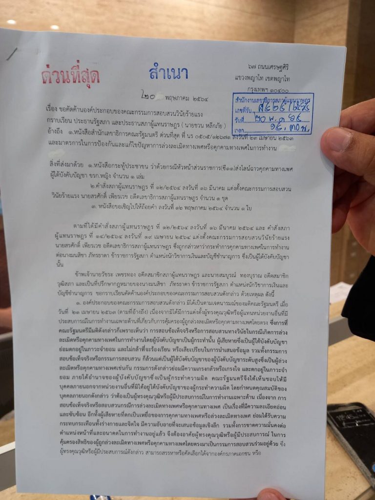 วันนี้ (20 พ.ค.64) เมื่อเวลา 14:30 น. ที่ อาคารรัฐสภา นายวัชระ เพชรทอง อดีตส.ส.ประชาธิปัตย์ และ นายสมบูรณ์ ทองบุราณ อดีตสว. ยื่นหนังสือผ่านเจ้าหน้าที่สารบรรณถึงนายชวน หลีกภัย ประธานสภาผู้แทนราษฎร คัดค้านองค์ประกอบของคณะกรรมการสอบสวนวินัยร้ายแรงนายสรศักดิ์ เพียรเวช อดีตเลขาธิการสภาผู้แทนราษฎร ซึ่งถูกกล่าวหาว่ากระทำการคุกคามทางเพศต่อข้าราชการรัฐสภา ซึ่งเป็นผู้ใต้บังคับบัญชา เนื่องจากองค์ประกอบของคณะกรรมการสอบสวนดังกล่าว ขัดกับมติคณะรัฐมนตรีของพล.อ.ประยุทธ์ จันทร์โอชา เมื่อวันที่ 21 เมษายน 2563 เพราะไม่ได้แต่งตั้งผู้ทรงคุณวุฒิหรือผู้แทนหน่วยงานอื่นที่มีประสบการณ์ในการทำงานเฉพาะด้านที่เกี่ยวกับการคุ้มครองผู้ถูกล่วงละเมิดหรือคุกคามทางเพศโดยตรงเข้าไปร่วมด้วย ซึ่งการสอบข้อเท็จจริงหรือการสอบสวนทางวินัยในกรณีเกิดการล่วงละเมิดหรือคุกคามทางเพศในการทำงานโดยผู้บังคับบัญชาเป็นผู้กระทำนั้น ผู้เสียหายซึ่งเป็นผู้ใต้บังคับบัญชา ย่อมตกอยู่ในภาวะจำยอม ไม่กล้าร้องเรียน หรือเสียเปรียบในการนำเสนอข้อมูล รวมทั้งกรรมการสอบข้อเท็จจริงหรือกรรมการสอบสวน ก็ล้วนแต่เป็นผู้ใต้บังคับบัญชาของผู้ถูกกล่าวหาด้วย ย่อมมีความเกรงกลัวหรือเกรงใจ และตกอยู่ในภาวะจำยอม ภายใต้อำนาจของผู้บังคับบัญชาซึ่งเป็นผู้กระทำความผิด