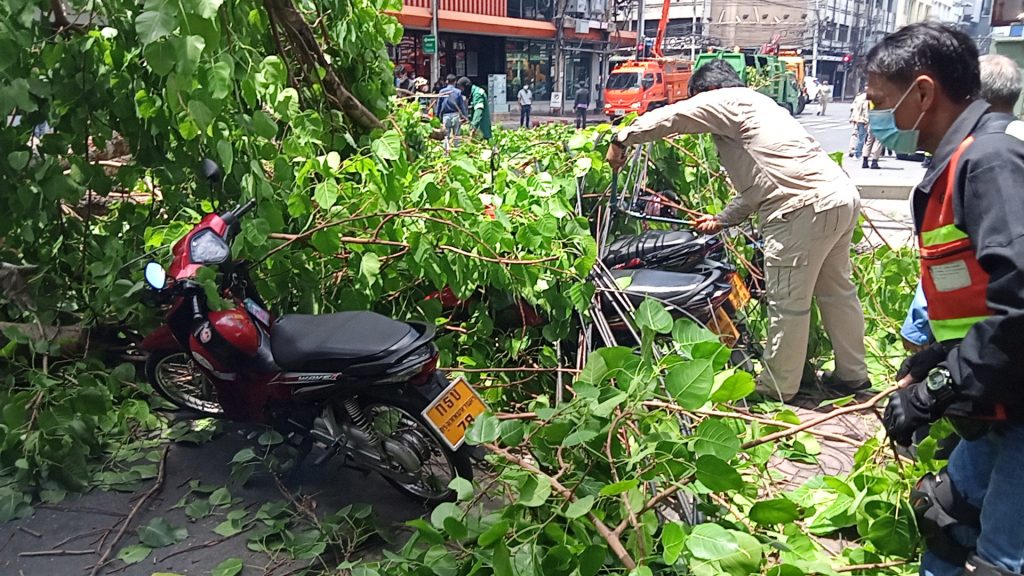 ต้นโพธิ์ยักษ์อายุกว่า 100 ปี หักโค่นทับเสาไฟฟ้า3 ต้น และ ทับรถยนต์ รถจักรยานยนต์ รวม5คัน บริเวณรถไฟใต้ดิน MRT สถานีสามยอด..(มีคลิป).