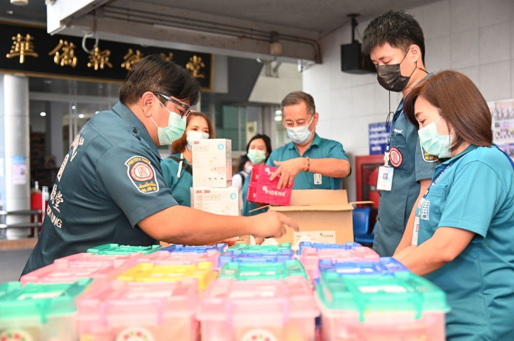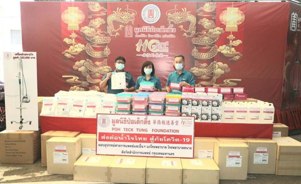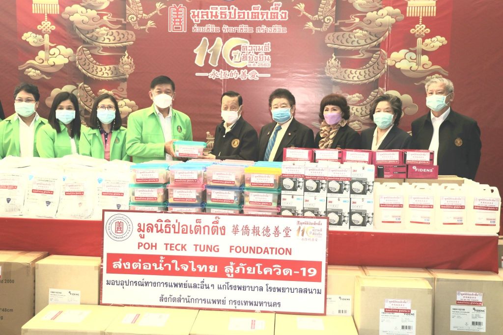 สำหรับการมอบอุปกรณ์และเครื่องมือทางการแพทย์ มูลนิธิป่อเต็กตึ๊งได้ริเริ่มดำเนินการมามอบมาแล้วตั้งแต่ปี พ.ศ. 2563 เป็นต้นมา โดยในครั้งแรก มูลนิธิฯ ทุ่มงบ 110 ล้านบาท มอบอุปกรณ์และเครื่องมือทางการแพทย์ที่จำเป็นแก่โรงพยาบาลที่ขาดแคลนทั้งในกรุงเทพฯ และถิ่นทุรกันดารในต่างจังหวัด รวม 37 แห่ง ทั่วประเทศ ซึ่งอุปกรณ์และเครื่องมือต่างๆ มูลนิธิฯ ได้ประสานโรงพยาบาลต่างๆ ให้แสดงความประสงค์สิ่งที่ขาดแคลน และเป็นสิ่งที่จำเป็นต้องใช้อย่างเร่งด่วน หลังจากนั้นภายหลังจากเกิดการแพร่ระบาดของไวรัสโคโรนา (โควิด-19) มูลนิธิฯ พร้อมทั้งจัดตั้งกองทุน “ธารน้ำใจ สู้ภัยโควิด-19” มอบอุปกรณ์และเครื่องมือทางการแพทย์มอบให้กับโรงพยาบาลที่ขาดแคลนต่อเนื่อง