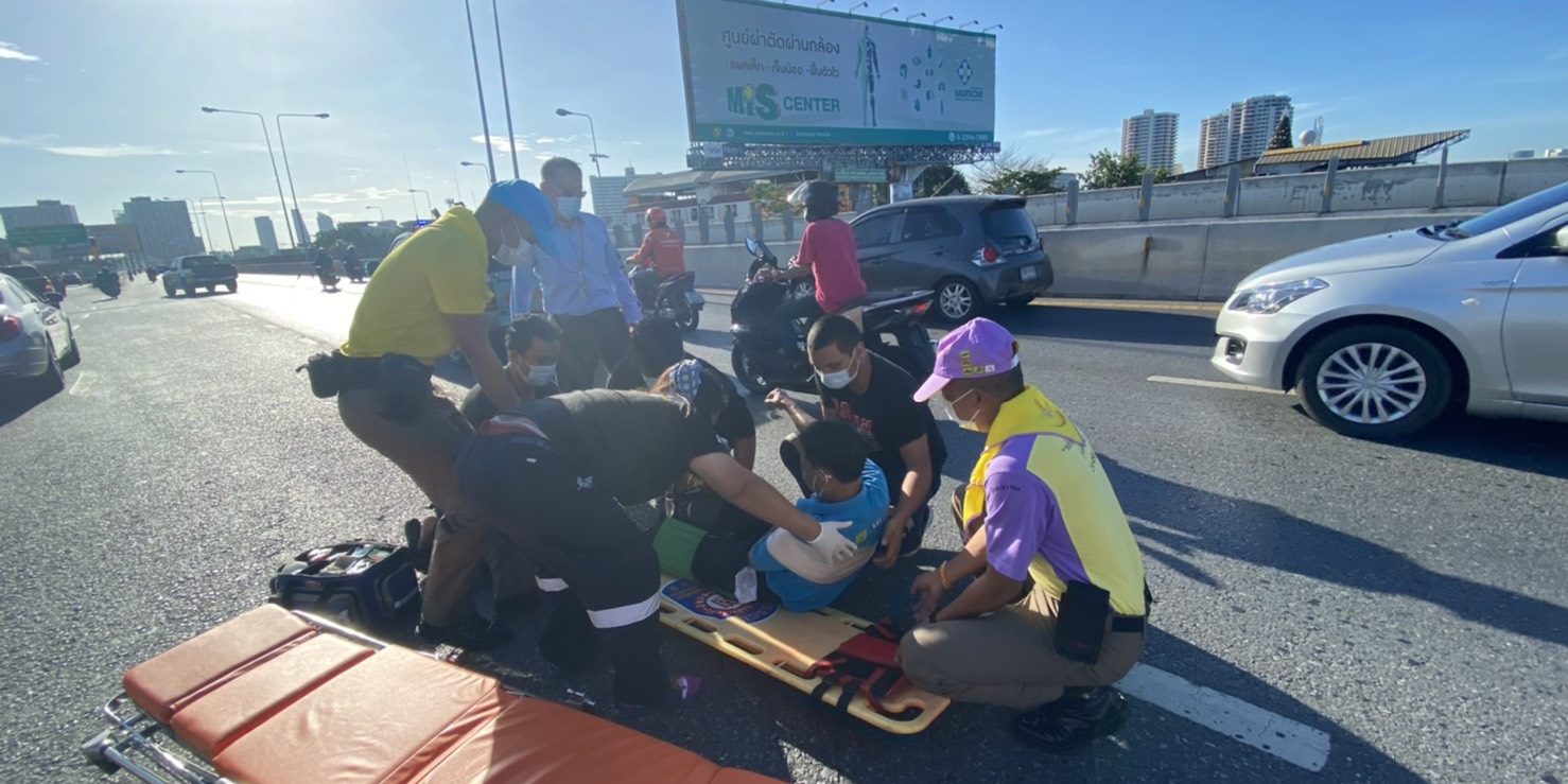 ล่าสุดหน่วยกู้ภัยเข้าตรวจสอบพบว่าชายดังกล่าวมีอาการขาซ้ายผิดรูปและไหล่หลุด จึงได้ทำการปฐมพยาบาล ก่อนนำตัวชายผู้ขับขี่รถจักรยานยนต์ส่งโรงพยาบาลพระนั่งเกล้าเพื่อให้แพทย์ทำการรักษาต่อไป