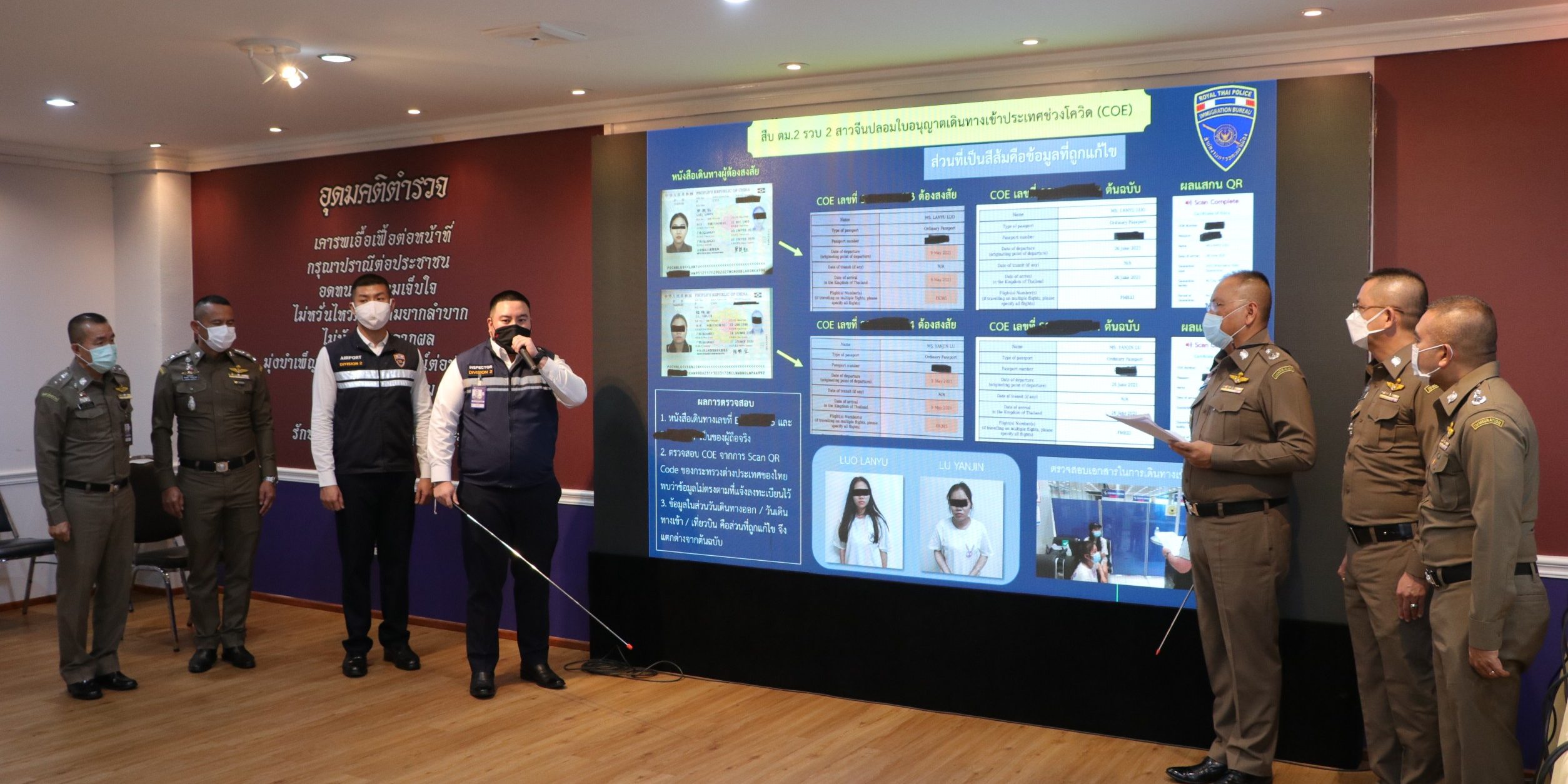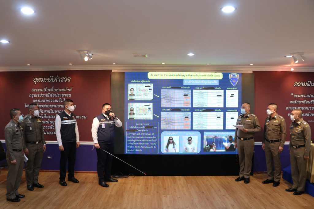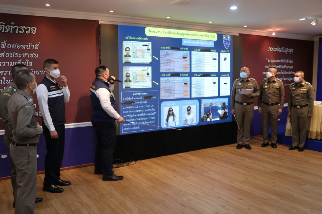 กล่าวคือ ตามนโยบายของผู้บังคับบัญชา ในระดับสำนักตำรวจแห่งชาติ และสำนักงานตรวจคนเข้าเมือง ให้หน่วยงานในสังกัดบูรณาการปฏิบัติระหว่างกัน เพื่อประสิทธิภาพในการป้องกันปราบปรามการกระทำความผิดต่างๆ รวมถึงกลุ่มบุคคล หรือขบวนการอาชญากรรมข้ามชาติต่างๆ ที่จะเข้ามาดำเนินการสร้างความเสียหายต่อภาพลักษณ์และเศรษฐกิจของประเทศได้ ทั้งนี้ ผลมาจากการบูรณาการปฏิบัติระหว่างกองกำกับการสืบสวนปราบปราม กองบังคับการตรวจคนเข้าเมือง 2 กับด่านควบคุมโรคติดต่อระหว่างประเทศและกักกันโรค ตรวจคัดกรองบุคคลที่เดินทางเข้ามาในราชอาณาจักร โดยสายการบินเอมิเรตส์แอร์ไลน์ เที่ยวบินที่ EK385 พบบุคคลต้องสงสัยหญิงชาวจีน 2 รายถือหนังสือรับรองการเดินทางเข้าราชอาณาจักร ที่ออกโดยสถานกงสุลใหญ่ ณ นครเซี่ยงไฮ้ (Certificate of Entry) หรือ COE และเจ้าหน้าที่ได้เข้าตรวจสอบพบ วันที่ได้การเข้าประเทศและเที่ยวบินไม่ตรวจตามที่ผู้ต้องสงสัยได้ลงทะเบียนไว้ จึงได้ประสานเจ้าหน้าที่นักการทูตชำนาญการคณะทำงานเพื่อเตรียมการรับมือการแพร่ระบาดของโรคติดเชื้อไวรัสโคโรนา 2019 เพื่อขอให้ยืนยันความจริงเท็จของเอกสารดังกล่าว จากการตรวจสอบพบว่า ได้รับการอนุมัติจากสถานกงสุลใหญ่ ณ นครเซี่ยงไฮ้จริง แต่ข้อมูลตามหนังสือไม่ตรงกับข้อมูลในระบบของกระทรวงการ ต่างประเทศซึ่งตรวจสอบได้ด้วยการ Scan QR Code กล่าวคือวันที่อนุญาตให้เดินทางเข้าราชอาณาจักรไม่ตรงกับเอกสารรับรอง และเจ้าหน้าที่นักการทูตชำนาญการคณะทำงานเพื่อเตรียมการรับมือการแพร่ระบาดของโรคติดเชื้อไวรัสโคโรนา 2019 ไม่เห็นควรให้เดินทางเข้าประเทศ กองกำกับการสืบสวนปราบปราม กองบังคับการตรวจคนเข้าเมือง 2 จึงได้แจ้งข้อกล่าวหา “ปลอมและใช้เอกสารราชการปลอม” และได้แจ้งสิทธิของผู้ต้องหาให้ทราบ ณ ที่จับกุมแล้ว และนำส่ง พนักงานสอบสวน สภ.ท่าอากาศยานสุวรรณภูมิ เพื่อดำเนินคดีตามกฎหมายต่อไป
