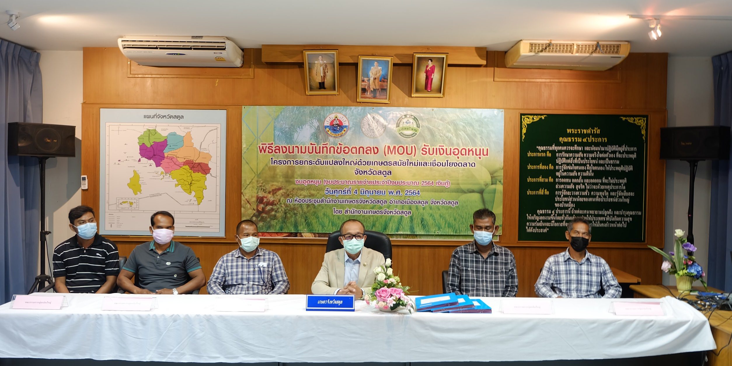 สำนักงานเกษตรจังหวัดสตูล โดยนายปัทพงศ์ สารบรรณ์ เกษตรจังหวัดสตูล จัดพิธีลงนามบันทึกข้อตกลง (MOU) รับเงินอุดหนุน ระหว่างกรมส่งเสริมการเกษตร (ผู้สนับสนุนงบประมาณ) กับกลุ่มเกษตรกรแปลงใหญ่ (ผู้ได้รับการสนับสนุนงบประมาณ) ภายใต้โครงการ “ยกระดับแปลงใหญ่ด้วยเกษตรสมัยใหม่และเชื่อมโยงตลาด” ณ สำนักงานเกษตรจังหวัดสตูล ตำบลพิมาน อำเภอเมือง จังหวัดสตูล