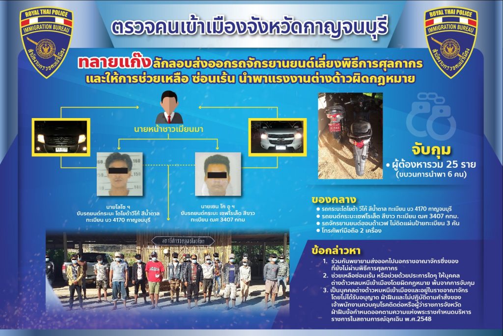 คดีแรก ตรวจคนเข้าเมืองจังหวัดกาญจนบุรี ทลายแก๊งลักลอบส่งออกรถจักรยานยนต์ : ในห้วงที่ผ่านมา ตม.จ.กาญจนบุรี เข้มงวดกวดขันกับขบวนการลักลอบเข้า-ออกตามแนวชายแดนธรรมชาติอยู่เสมอมา โดยยกตัวอย่างในกรณีนี้ กลุ่มผู้ต้องหามีความพยายามนำรถจักรยานยนต์ออกจากประเทศไทยโดยไม่ผ่านพิธีการทางศุลกากรที่ถูกต้อง ทั้งยังให้การช่วยเหลือช่อนเร้น นำพา บุคคลต่างด้าวซึ่งหลบหนีเข้าเมืองโดยการขนย้ายฝ่าฝืน พ.ร.ก.การบริหารราชการในสถานการณ์ฉุกเฉินฯอีกด้วย โดยมีรายละเอียดดังนี้