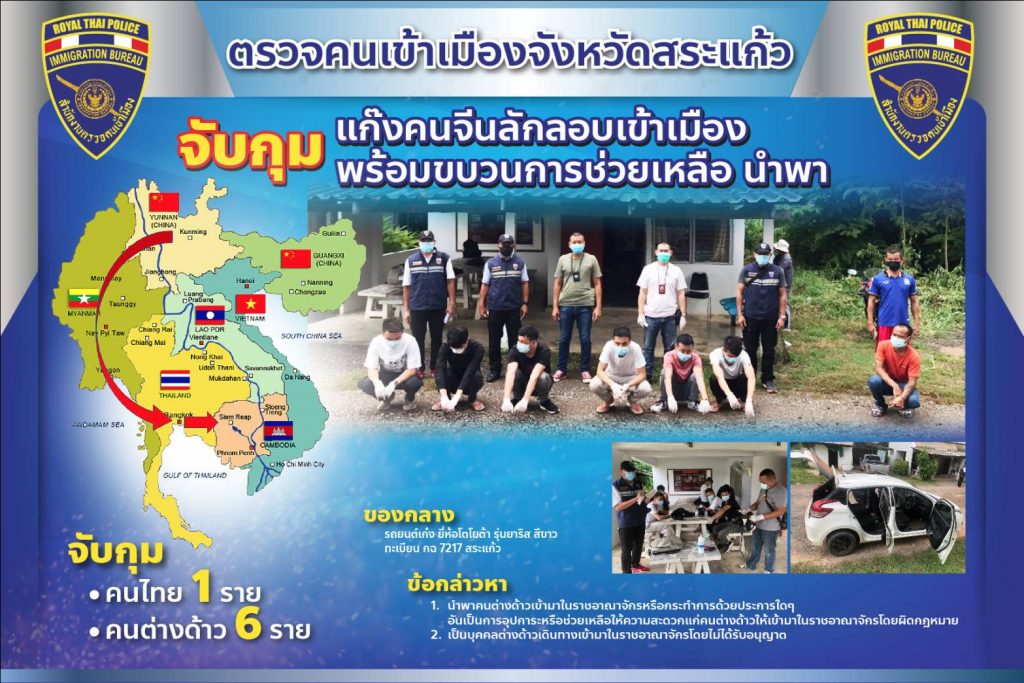 โดยมีการแจ้งข้อกล่าวหา ผู้ต้องหาที่ 1 “นำพาคนต่างด้าวเข้ามาในราชอาณาจักรหรือกระทำการด้วยประการใดๆ อันเป็นการอุปการะหรือช่วยเหลือให้ความสะดวกแก่คนต่างด้าวให้เข้ามาในราชอาณาจักรโดยผิดกฎหมาย และผู้ต้องหาที่ 2-7 (คนต่างด้าวชาวจีน) “เป็นบุคคลต่างด้าวเดินทางเข้ามาในราชอาณาจักรโดยไม่ได้รับอนุญาต” โดยมีการตรวจยึดของกลาง คือรถยนต์เก๋ง ยี่ห้อโตโยต้า รุ่นยาริส สีขาว ทะเบียน สระแก้ว