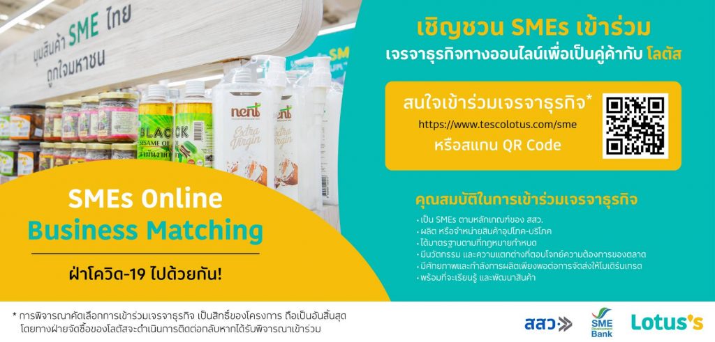 เมื่อวันที่ 11 มิถุนายน 2564 : โลตัส ร่วมกับ ธนาคารพัฒนาวิสาหกิจขนาดกลางและขนาดย่อมแห่งประเทศไทย (SME D Bank) และ สำนักงานส่งเสริมวิสาหกิจขนาดกลางและขนาดย่อม (สสว.) จัดการเจรจาธุรกิจการค้า Online Business Matching ในทุกวันศุกร์ที่สามของเดือน เปิดโอกาสให้ผู้ประกอบการรายย่อย SME นำเสนอสินค้าให้กับทีมงานจัดซื้อทุกหมวดหมู่สินค้าของโลตัสโดยตรง สร้างโอกาสในการวางจำหน่ายสินค้าที่สาขาของโลตัส ทั่วประเทศ และช่องทางออนไลน์ หลังกิจกรรม Business Matching ครั้งแรกประสบความสำเร็จ มีผู้ประกอบการ SME ที่ได้รับคัดเลือกและอยู่ในระหว่างการพิจารณา 46 ราย โดยโลตัสเดินหน้าจัดกิจกรรมเจรจาธุรกิจการค้า (Business Matching) ทุกเดือนเพื่อช่วยสนับสนุนผู้ประกอบการรายย่อย ผู้ที่สนใจสามารถดูข้อมูลเพิ่มเติมได้ที่ www.TescoLotus.com/SME