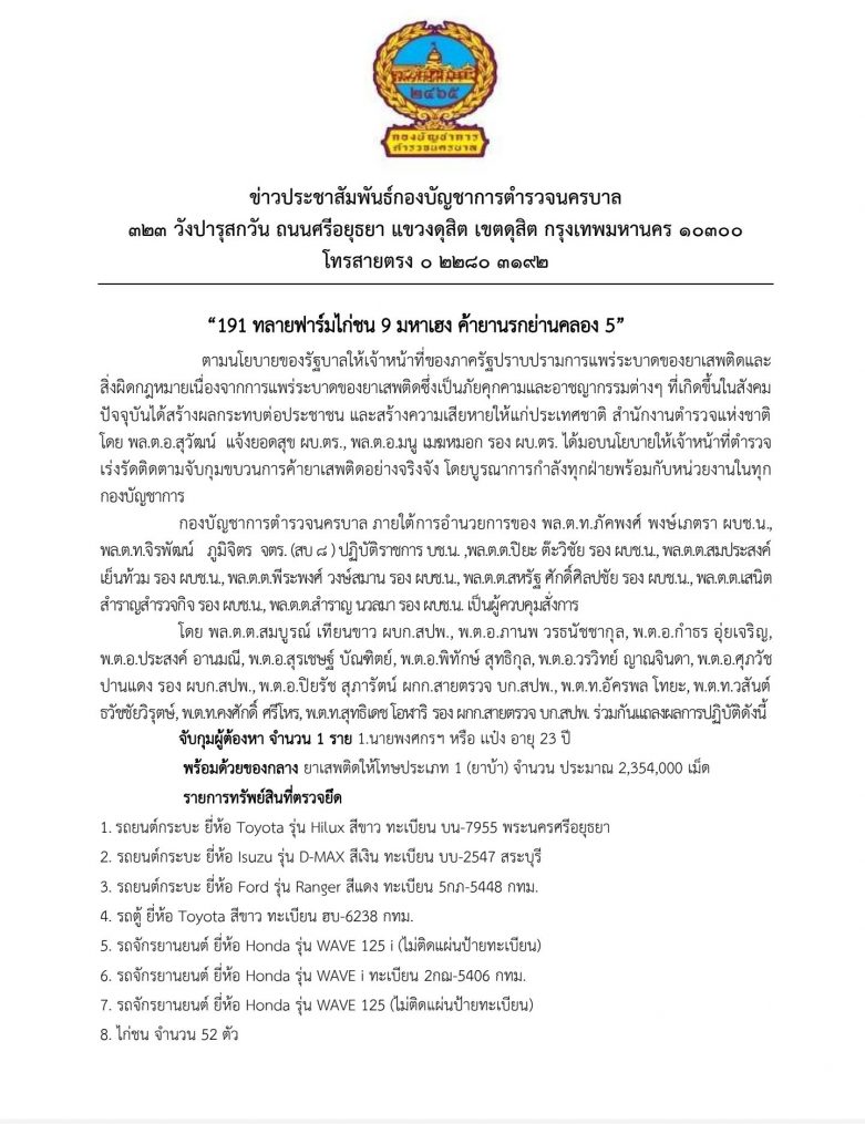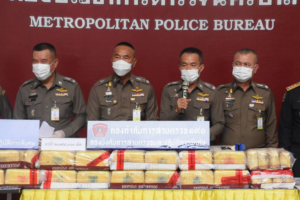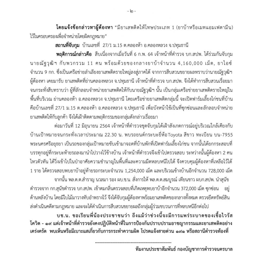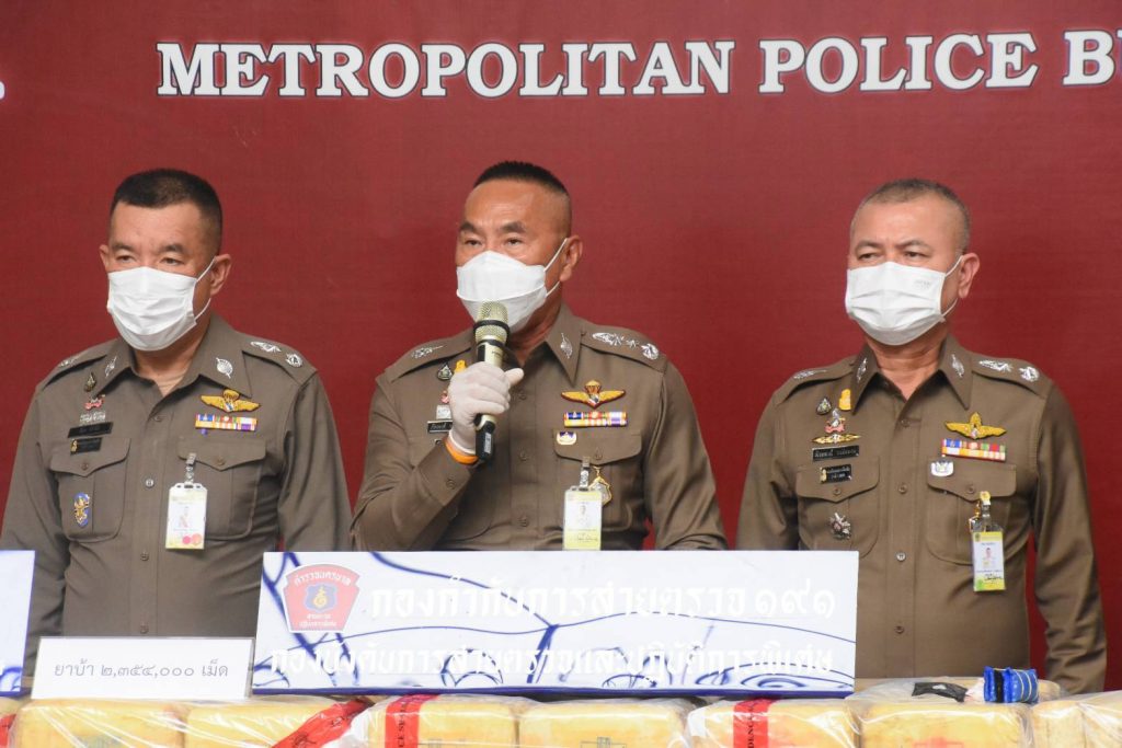 วันนี้(จันทร์ที่ 14 มิ.ย. 64) เวลา 13.30 น. พล.ต.ท.ภัคพงศ์ พงษ์เภตรา ผบช.น. พร้อมด้วย พล.ต.ต.ปิยะ ต๊ะวิชัย รอง ผบช.น./โฆษก บช.น., พล.ต.ต.พีระพงศ์ วงษ์สมาน รอง ผบช.น., พล.ต.ต.สำราญ นวลมา รอง ผบช.น., พล.ต.ต.อัศวยุทธ นุชพุ่ม ผบก.ประจำ บช.น.รรท.บก.น.2, พล.ต.ต.โสภณ สารพัฒน์ ผบก.น.5, พล.ต.ต.สมบูรณ์ เทียนขาว ผบก.สปพ. และผู้แทน ปปส.กทม. ร่วมแถลงข่าวการจับกุมยาเสพติดดังกล่าว ณ ลานเอนกประสงค์ ชั้น1 อาคาร บช.น./ทีมงานประชาสัมพันธ์ บช.น.