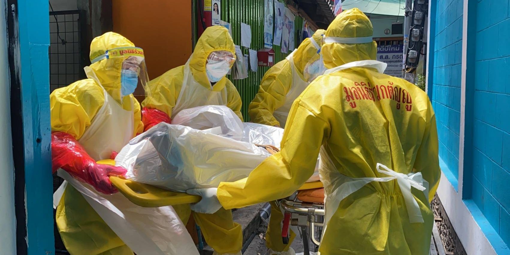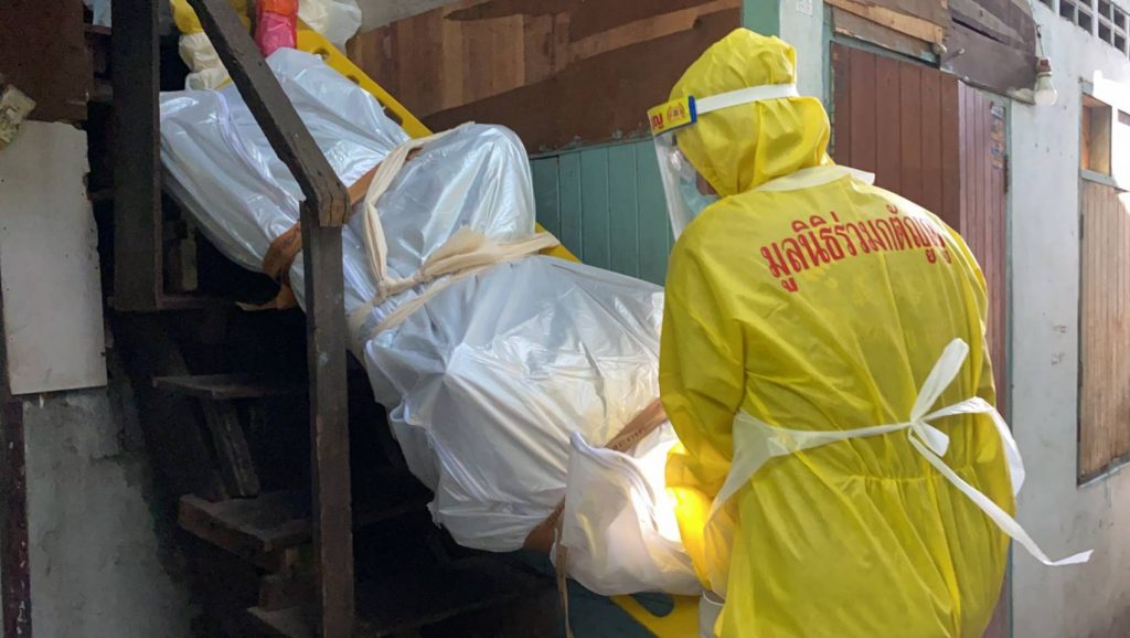เพื่อความปลอดภัย มูลนิธิร่วมกตัญญู จึงส่ง ทีมปฏิบัติการเฉพาะทาง Covid-19 สวมใส่ชุดป้องกันตัวไปช่วยเก็บศพ ส่งสถาบันนิติเวช รพ.จุฬาฯ ให้แพทย์ ตรวจสอบต่อไป