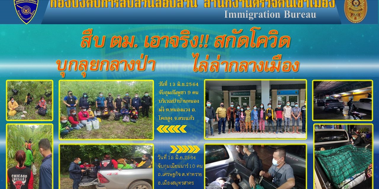 เจ้าหน้าที่ กก.2 บก.สส.สตม.บุกป่าชายแดนจับกุมแรงงานกัมพูชาลักลอบเข้าเมือง และจับขบวนการนำพาแรงงานชาวเมียนมา สมุทรสาคร ตามสั่งการ พล.ต.ท.สมพงษ์ ชิงดวง ผบช.สตม. ให้มีการเฝ้าระวังป้องกันไม่ให้มีการลักลอบเข้าไทยโดยไม่ผ่านการคัดกรองโรคยังคงเป็นภารกิจสำคัญที่ สตม.ดำรงความเข้มงวดด้วยมาตรการเฝ้าตรวจพื้นที่ตลอด 24 ชม. จับกุม ผู้ลักลอบเข้าเมืองโดยผิดกฎหมายรวมถึงผู้นำพาทั้งชาวไทยและต่างด้าว พล.ต.ต.พันธนะ นุชนารถ ผบก.สส.สตม.,พ.ต.อ.สถิตย์ พรมอุทัย รอง ผบก.สส.สตม. และ พ.ต.อ.อาภากร โกมลสุทธิ รอง ผบก.สส.สตม. จึงสั่งการให้ กก.2 บก.สส.สตม. สืบสวนจับกุมแรงงานต่างด้าวและขบวการนำพาโดยเร่งด่วน พ.ต.อ.ปฏิญญา จีรชนาสิน ผกก.2 บก.สส.สตม.จึงได้ให้ จนท.สืบสวนหาข่าวจนทราบว่ามีแรงงานกัมพูชาใช้วิธีการเดินเท้าจากฝั่งกัมพูชาลักลอบเข้าประเทศไทยและหลบซ่อนตามป่าแนวตะเข็บชายแดนบริเวณหมู่บ้านหนองมั่ง ต.หนองแวง อ.โคกสูง จ.สระแก้ว เพื่อรอการลำเลียงเข้าสู่เมืองชั้นใน จึงได้วางกำลังเพื่อจับกุม จนกระทั่งเวลาประมาณ 05.00 น. จนท.ตรวจพบแรงงานกัมพูชาจำนวน 9 คน หลบซ่อนอยู่ในป่า จึงได้แสดงตัวเข้าจับกุม แรงงานต่างด้าวให้การว่ามีนายหน้าชาวกัมพูชาเป็นคนนำทางโดยเดินเท้าประมาณ 10 กม. มายังจุดหลบซ่อนเสียค่าใช้จ่าย คนละ 500 บาท เพื่อรอการเคลื่อนย้ายเข้าไปทำงานที่ จ.ระยอง,ปทุมธานี และสมุทรปราการ หากไปถึงปลายทางในเมืองชั้นในได้ ต้องจ่ายเพิ่มอีกคนละ 15,000-20,000 บาท จนท.จึงได้แจ้งข้อกล่าวหา ส่ง พนักงานสอบสวน สภ.โคกสูง ดำเนินคดีตามกฎหมายต่อไป