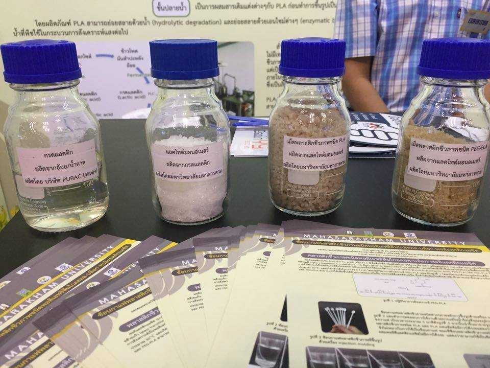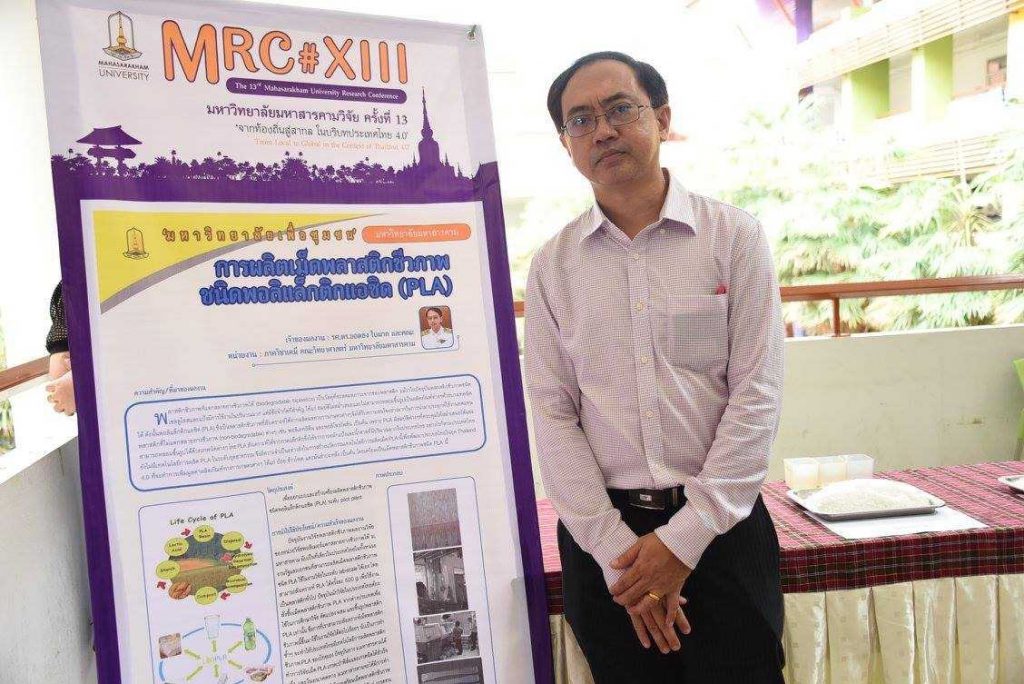 รศ.ดร.ยอดธง ใบมาก ภาควิชาเคมี คณะวิทยาศาสตร์ มหาวิทยาลัยมหาสารคาม หัวหน้าโครงการวิจัย เปิดเผยว่า โดยปกติขั้นตอนการผลิตพลาสติกชีวภาพ แบ่งออกเป็น 3 ขั้นตอน คือ ขั้นต้นน้ำ เป็นการผลิตกรดแลคติค จากแป้ง และน้ำตาล โดยใช้ข้าวโพด มันสำปะหลัง หรืออ้อยเป็นวัตถุดิบ ขั้นกลางน้ำ เป็นการนำกรดแลคติคมาสังเคราะห์เพื่อให้ได้เม็ดพลาสติกชีวภาพ (PLA : Polylactic acid) และขั้นปลายน้ำ เป็นการนำเม็ดพลาสติกชีวภาพไปผสมสูตรเพื่อขึ้นรูปเป็นผลิตภัณฑ์พลาสติกชนิดต่างๆ ประเทศไทยจึงเป็นเพียงผู้ผลิตปลายน้ำที่ยังไม่มีเทคโนโลยีการผลิตเป็นของตัวเองแบบครบวงจร นอกจากการร่วมทุนกับต่างชาติตั้งโรงงานผลิตในประเทศไทยโดยใช้เทคโนโลยีของต่างประเทศ จากการสนับสนุนทุนวิจัยจาก (วช.) มหาวิทยาลัยมหาสารคามได้ทำงานร่วมกับมหาวิทยาลัยเทคโนโลยีสุรนารี โดย ม.สุรนารี มีบทบาทในการผลิตกรดแลคติคเพื่อให้ ม. มหาสารคามนำสังเคราะห์เป็นเม็ดพลาสติก PLA แล้วจึงนำเม็ดพลาสติกที่ได้ไปผสมเป็นสูตรต่างๆ เพื่อขึ้นรูปเป็นผลิตภัณฑ์พลาสติกชีวภาพ