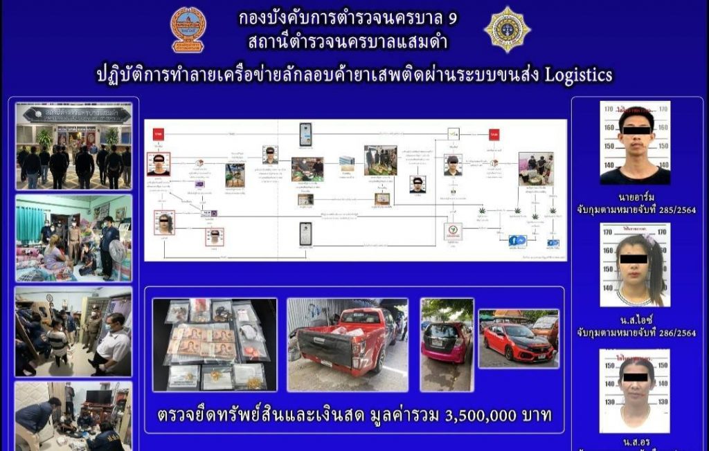 การจับกุมครั้งนี้ สืบเนื่องมาจากเมื่อวันที่ 4 ก.พ.64 เจ้าหน้าที่ตำรวจฝ่ายสืบสวน สน.แสมดำ จับกุมผู้ต้องหา 2 คน คือนายเดฯ และนายก๊อตฯ พร้อมกัญชาอัดแท่ง น้ำหนักรวม 97 กก. และอุปกรณ์ส่งพัสดุบริเวณร้านรับส่งพัสดุไม่มีชื่อ ปากซอยบางกระดี่ 37 แขวงแสมดำ เขตบางขุนเทียน กรุงเทพฯ ต่อเนื่องหมู่บ้านสินทวีโครงการ 4 ซอย 5 ถนนพระราม 2 แขวงบางมด เขตจอมทอง กรุงเทพฯ ประกอบกับก่อนหน้านี้ เมื่อวันที่ 2 ก.พ.64 ตำรวจสน.แสมดำ จับกุมผู้ต้องหาอีก 2 ราย พร้อมกัญชาอัดแท่ง รวม 9 กก. อุปกรณ์ส่งพัสดุ ใบเสร็จรับเงิน และใบส่งของให้ลูกค้าจำนวนมาก โดยจับกุมได้ที่ร้านส่งพัสดุเดียวกัน