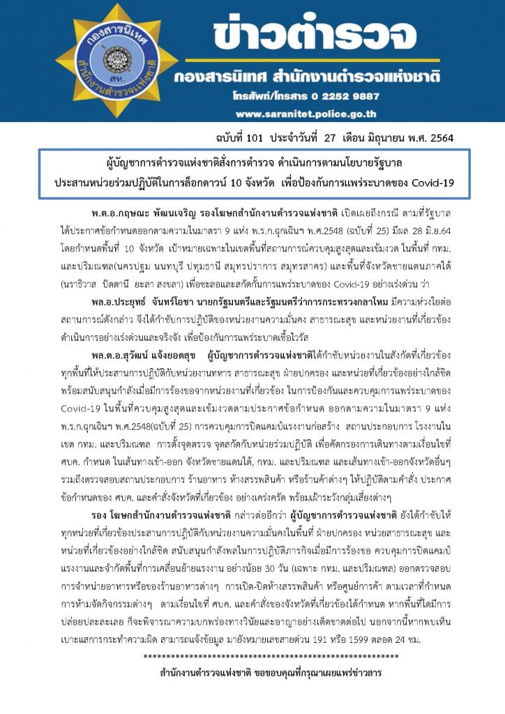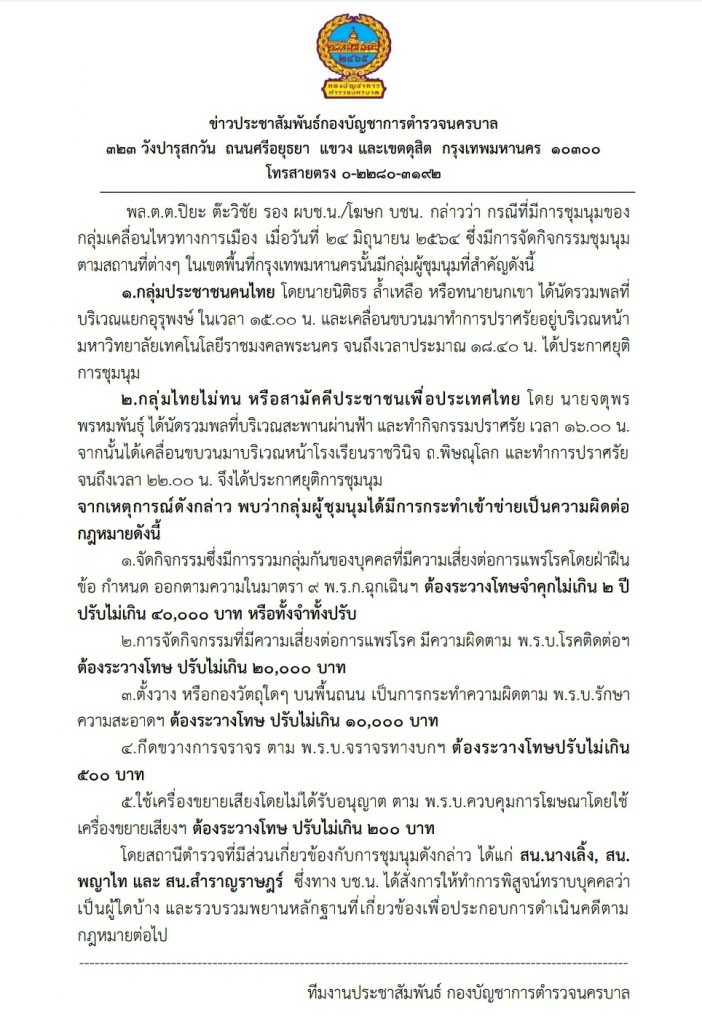 วันนี้(27 มิ.ย.64) เมื่อเวลา10.30 น. ที่กองบัญชาการตำรวจนครบาลพล.ต.ต.ปิยะ ต๊ะวิชัย รอง ผบช.น./โฆษก บชน. กล่าวว่า กรณีที่มีการชุมนุมของกลุ่มเคลื่อนไหวทางการเมือง เมื่อวันที่ 24 มิถุนายน 2564 ซึ่งมีการจัดกิจกรรมชุมนุม ตามสถานที่ต่างๆ ในเขตพื้นที่กรุงเทพมหานครนั้นมีกลุ่มผู้ชุมนุมที่สำคัญดังนี้