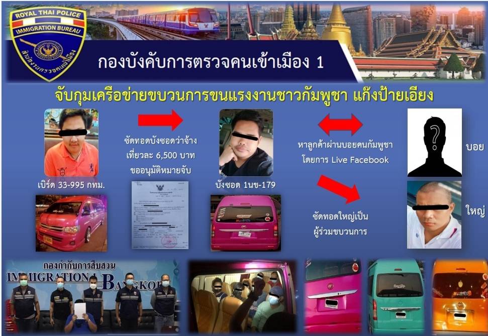 เจ้าหน้าที่ชุดจับกุมจึงได้ใช้รถยนต์ตรวจการณ์อัจฉริยะ สตม. แสดงตัว ให้สัญญาณเพื่อหยุดรถคันดังกล่าว และทำการแสดงตนเป็นเจ้าหน้าที่ตำรวจเพื่อทำการตรวจสอบเอกสารหลักฐานต่างๆ จากการตรวจสอบคนขับพบว่าคือ นายเบิร์ดฯ (นามสมมุติ) หรือผู้ถูกจับกุมที่ 1 เป็นคนขับรถตู้ และพบแรงงานต่างด้าวจำนวน 8 คน นั่งอยู่ในรถ โดยตรวจพบว่าเป็นแรงงานต่างด้าวสัญชาติกัมพูชา ไม่มีเอกสารหนังสือเดินทาง จำนวน 3 คน,การอนุญาตสิ้นสุด จำนวน 2 คน มีเอกสารหนังสือเดินทางถูกต้อง 3 คน จึงได้จับกุมตัวนายเบิร์ดฯ ผู้ขับรถตู้และแจ้งข้อหาตาม ม.64 พ.ร.บ.คนเข้าเมืองฯ “ให้เข้าพักอาศัย ซ่อนเร้น หรือช่วยด้วยประการใดๆ เพื่อให้คนต่างด้าวนั้นพ้นจากการจับกุม” และ “ฝ่าฝืนประกาศกรุงเทพมหานคร เรื่อง มาตรการเฝ้าระวัง ป้องกันและควบคุมการแพร่ระบาดของโรคติดเชื้อไวรัสโคโรนา 2019 ลงวันที่ 22 พฤษภาคม 2564 ตามมาตรา 51 แห่ง พ.ร.บ.โรคติดต่อ พ.ศ.2558”