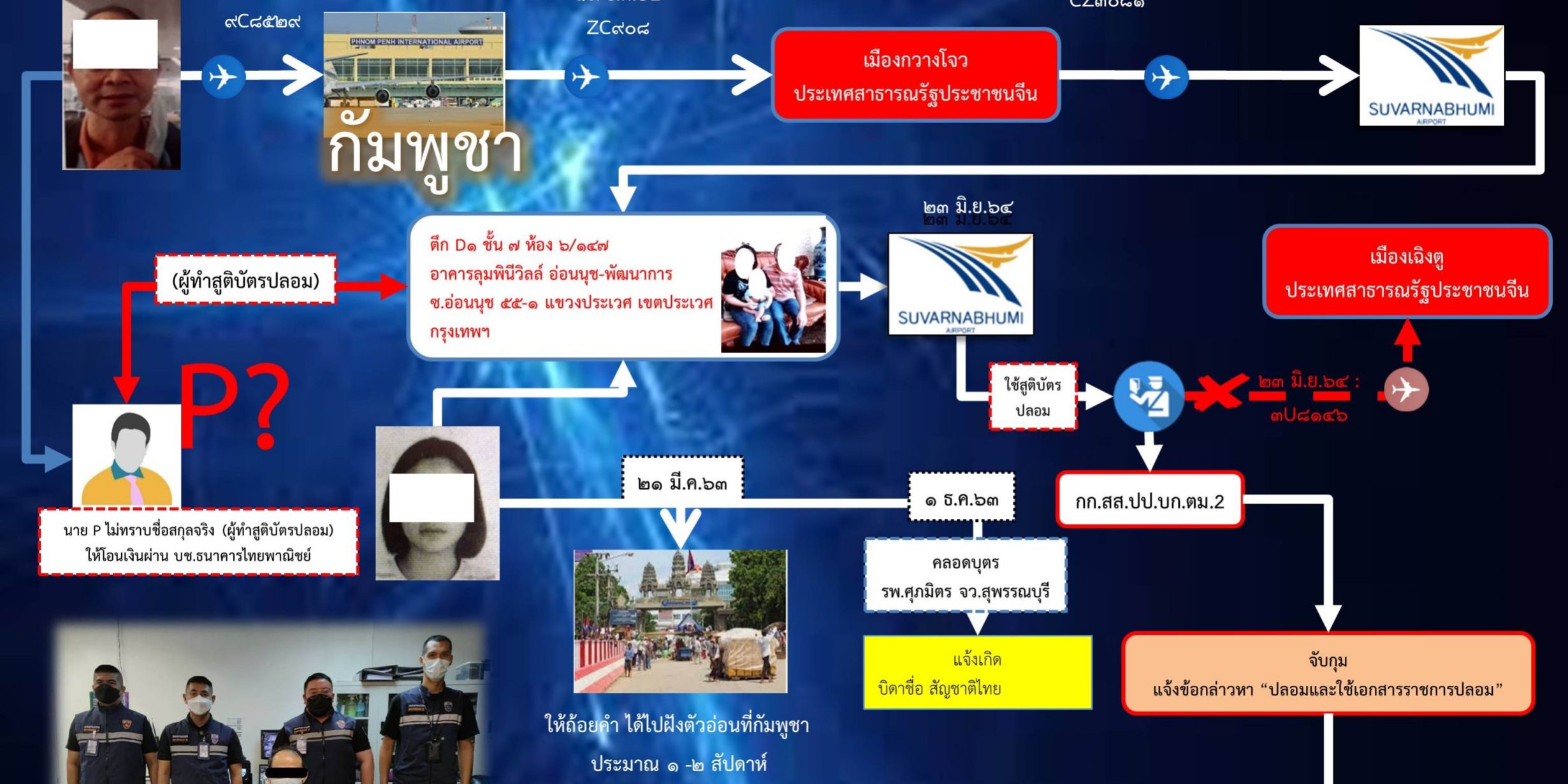 ซึ่งระบุว่า นางสาว บี เป็นมารดา และ ผู้ถูกจับกุม สัญชาติจีน เป็นบิดา เมื่อเจ้าหน้าที่เจ้าหน้าที่ฝ่าย ตม.ขาออกฯ ได้ดำเนินการตรวจสอบใบสูติบัตรดังกล่าว โดยสแกนข้อมูลจาก QR Code บนใบสูติบัตร ปรากฏข้อมูลหมายเลขประจำตัวประชาชน ตรงกับหมายเลขประจำตัวประชาชนของเด็กชายเก่งฯ ที่แสดงในใบสูติบัตรจริง ทั้งนี้ การตรวจสอบดังกล่าวเป็นการตรวจสอบตามหลักการตรวจสอบใบสูติบัตรเบื้องต้น ขณะเดียวกันได้ประสานมายัง กองกำกับการสืบสวนปราบปราม กองบังคับการตรวจคนเข้าเมือง 2 ในการร่วมตรวจสอบผู้โดยสารรายนี้ โดยเจ้าหน้าที่ กองกำกับการสืบสวนปราบปราม กองบังคับการตรวจคนเข้าเมือง 2 ได้ดำเนินการตรวจสอบหมายเลขประจำตัวประชาชนของเด็กชายเก่งฯจากระบบฐานข้อมูลทะเบียนราษฎรที่เชี่อมต่อกับระบบ POLIS ผลการตรวจสอบพบว่า เด็กชายเก่งฯมีมารดาคือ นางสาวบี ส่วนบิดาไม่ใช่ผู้ถูกจับกุม แต่กลับเป็นนายซี (นามสมมติ) สัญชาติไทย ซึ่งข้อมูลไม่ตรงกับใบสูติบัตรที่ผู้ถูกจับกุมนำมาแสดงกับเจ้าหน้าที่ตรวจคนเข้าเมือง จึงได้ดำเนินการจับกุมส่ง พงส.สภ.ท่าอากาศยานสุวรรณภูมิ เพื่อดำเนินการตามกฎหมายต่อไป