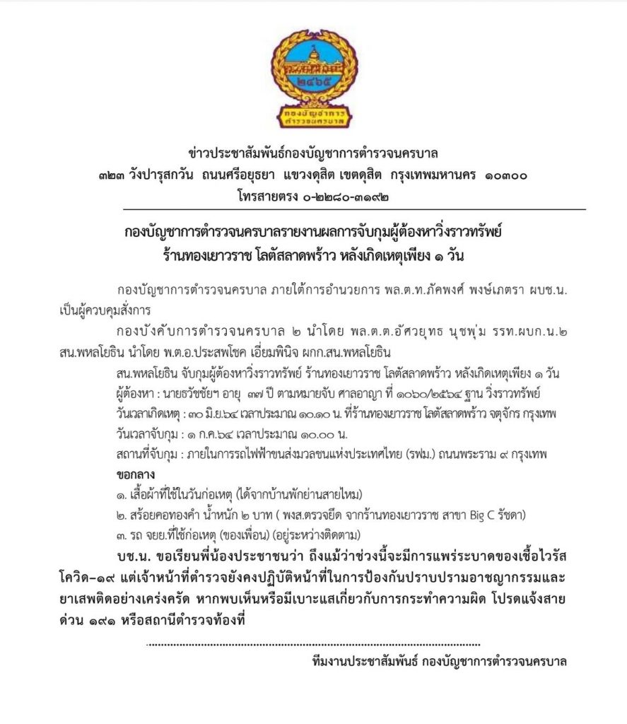 สน.พหลโยธิน สามารถจับกุมผู้ต้องหาวิ่งราวทรัพย์ ร้านทองเยาวราช โลตัสลาดพร้าว หลังเกิดเหตุเพียง 1 วัน ผู้ต้องหาคือ นายธวัชชัยฯ อายุ 37 ปี ตามหมายจับ ศาลอาญา ที่ 1060/2564 ฐาน วิ่งราวทรัพย์ เกิดเหตุวันที่ 30 มิ.ย.64 เวลาประมาณ 10.10 น. ที่ร้านทองเยาวราช โลตัสลาดพร้าว จตุจักร กรุงเทพฯ โดยสามารถจับกุมผู้ต้องหาได้เมื่อวันที่ 1 ก.ค.64 เวลาประมาณ 10.00 น. ได้ ภายในการรถไฟฟ้าขนส่งมวลชนแห่งประเทศไทย (รฟม.) ถนนพระราม 9 กรุงเทพฯ พร้อมด้วย ของกลาง เสื้อผ้าที่ใช้ในวันก่อเหตุ (ได้จากบ้านพักย่านสายไหม),สร้อยคอทองคำ น้ำหนัก 2 บาท (พงส.ตรวจยึด จากร้านทองเยาวราช สาขา Big C รัชดา) และ รถ จยย.ที่ใช้ก่อเหตุ (ของเพื่อน) (อยู่ระหว่างติดตาม)
