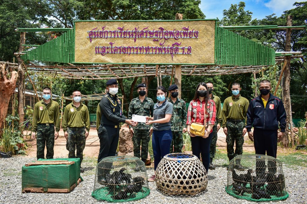 ศูนย์การเรียนรู้ โครงการเศรษฐกิจพอเพียงและโครงการทหารพันธุ์ดี จัดอบรมเทคโนโลยีการเลี้ยงไก่พื้นเมืองประดู่หางดำ ให้กับกำลังพลกรมทหารราบที่ 8 และหน่วยรอง ณ ศูนย์การเรียนรู้ โครงการเศรษฐกิจพอเพียงและโครงการทหารพันธุ์ดี ค่ายสีหราชเดโชไชย ต.ศิลา อ.เมือง จ.ขอนแก่น โดยได้รับการสนับสนุน วิทยากรจาก ศูนย์เครือข่ายวิจัยด้านการปรับปรุงพันธุ์และโอมิกส์ทางสัตว์ มหาวิทยาลัยขอนแก่น ซึ่งอบรมให้ การดูแลไก่เล็ก” ให้ความรู้ ความเข้าใจวิธีการกกไก่, การให้อาหาร การให้น้ำ เพื่อให้ไก่มีอัตราการรอดสูงขึ้น ฐานที่ รวมถึงโรคที่สำคัญในสัตว์ปีก” การป้องกันรักษาโรคของไก่ สร้างความเข้าใจให้ความรู้ ฝึกการให้วัคซีนป้องกันโรค การดูแลไก่ การให้วัคซีนตามห้วงอายุและฤดูกาล พร้อมให้ความรู้เกี่ยวกับอัตลักษณ์ไก่พื้นเมือง การสร้างการรับรู้และการตลาด” ซึ่งไก่ประดู่หางดำได้รับการปรับปรุงพันธุ์ ให้มีลักษณะ โตดี ไข่ดก อกกว้าง เนื้อแน่น รสชาติอร่อย ถูกปาก สร้างการมูลค่าเพิ่ม นำไปสู่การตลาดในเครือข่ายได้อย่างกว้างขวาง ทั้งนี้ ศูนย์การเรียนรู้ โครงการเศรษฐกิจพอเพียงและโครงการทหารพันธุ์ดีได้เพาะ และขยายพันธุ์ เพื่อแบ่งปันให้กับครอบครัวกำลังพล และพี่น้องประชาชน ชุมชนรอบค่ายสีหราชเดโชไชย บรรเทาความเดือดร้อนของประชาชนในสถานการณ์การแพร่ระบาดของเชื้อไวรัส COVID – 19