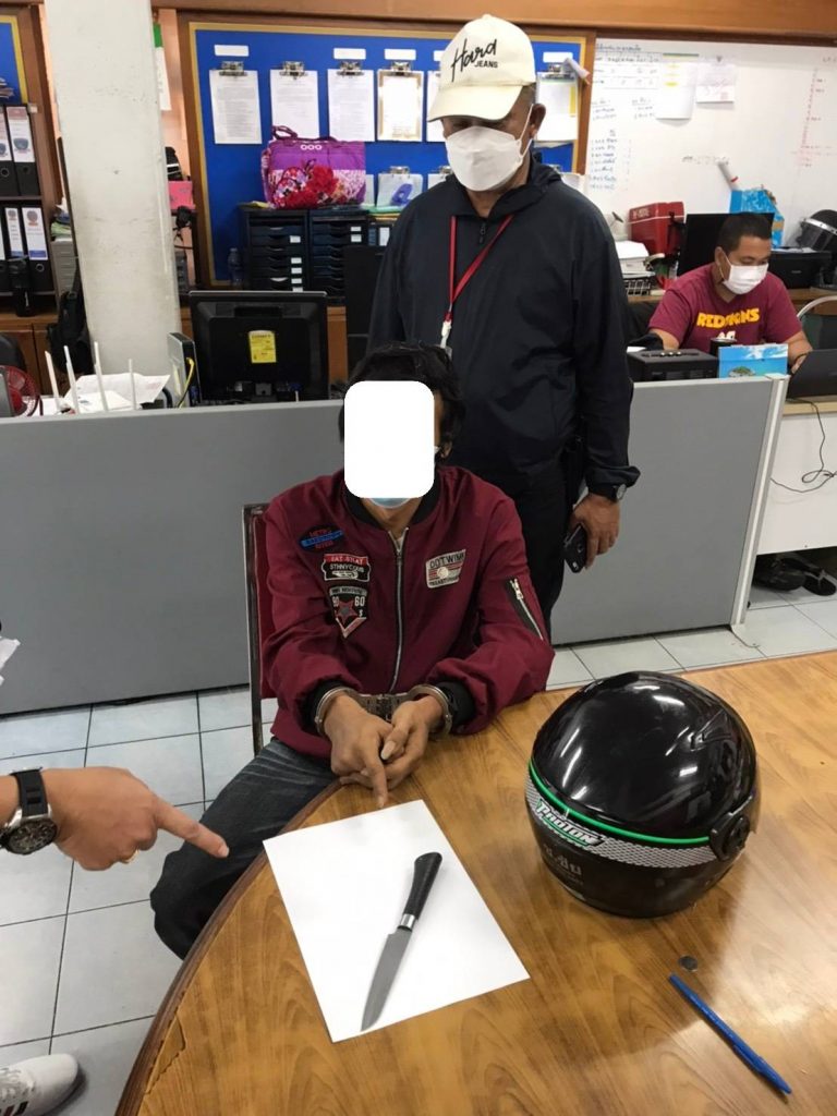 แขวงวัดอรุณ เขตบางกอกใหญ่ กทม. โดย ผู้ต้องหา เป็นชายไม่ทราบชื่อ 1 คน สวมหมวกกันน๊อคแบบเต็มใบสีดำ เสื้อแขนยาวสีแดง กางเกงยีนขายาว รองเท้าผ้าใบสีดำ ใช้มีดพกจีพนักงานของร้าน ได้เงินสดไปจำนวน 1,940 บาท และได้หลบหนีโดยใช้รถ จยย. รุ่นเอ็นเม็ก สีน้ำเงิน-เทา เป็นยานพาหนะ นั้น