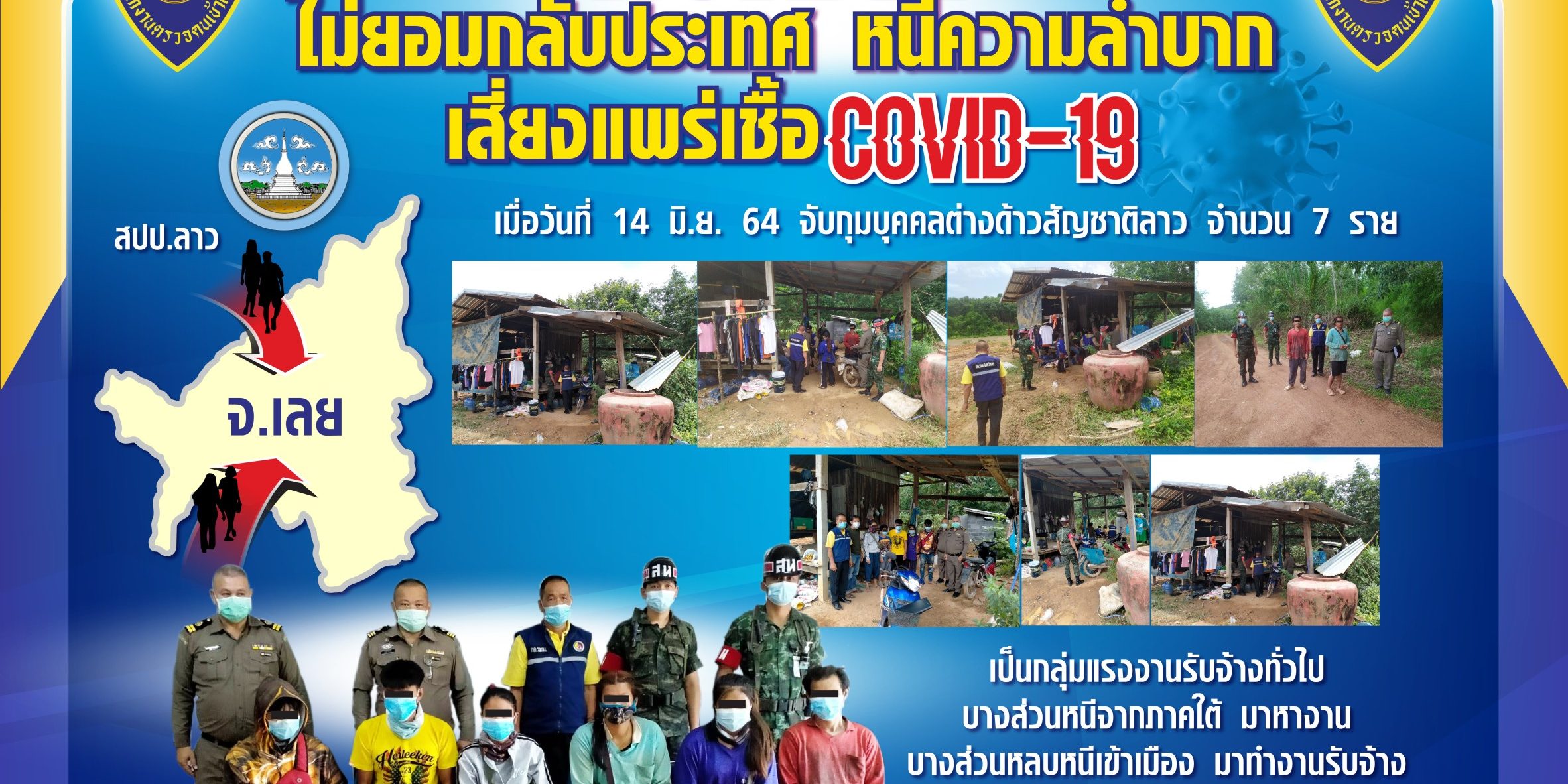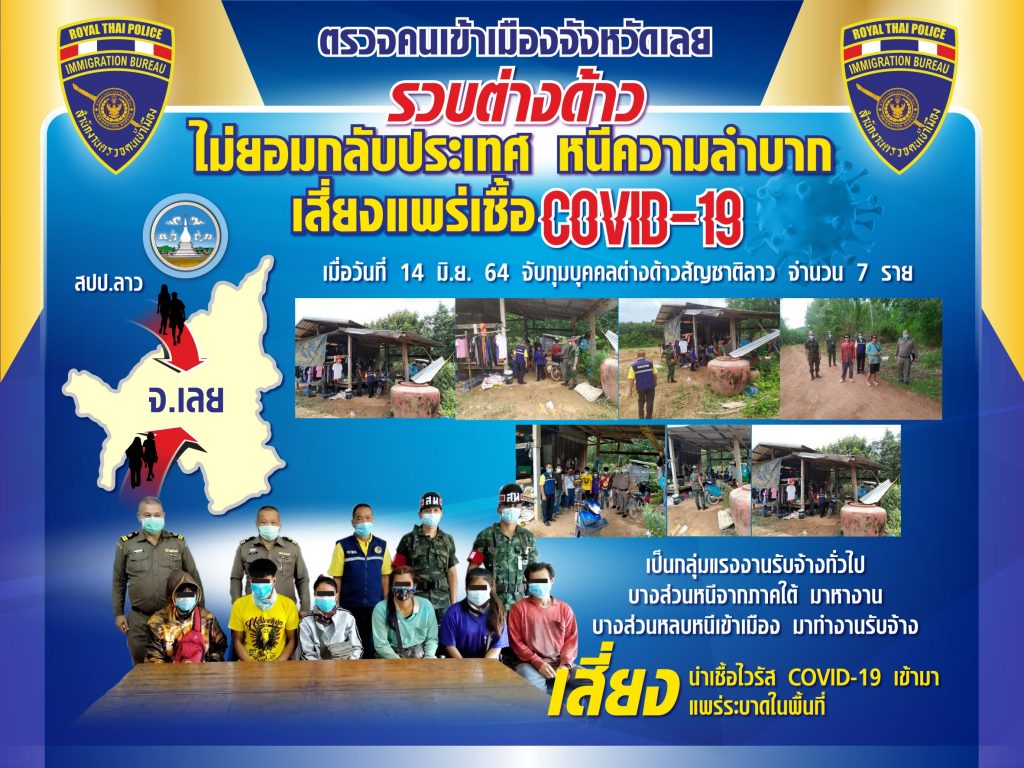 ตม.จ.เลย บูรณาการกับหน่วยงานที่เกี่ยวข้องตรวจสอบตามนโยบายสกัดกั้น ป้องกันบุคคลต่างด้าวหลบหนีเข้าเมือง และลักลอบเข้ามาทำงานโดยผิดกฎหมาย เพื่อป้องกันการนำเชื้อไวรัสโควิด–19 เข้ามาแพร่ระบาดในพื้นที่ จ.เลย โดยสามารถจับกุมบุคคลต่างด้าวสัญชาติลาวได้ 7 ราย กระทำผิดฐาน “อยู่ในรายอาณาจักรเกินกว่าที่ได้รับอนุญาต” จำนวน 4 ราย และ “เป็นบุคคล